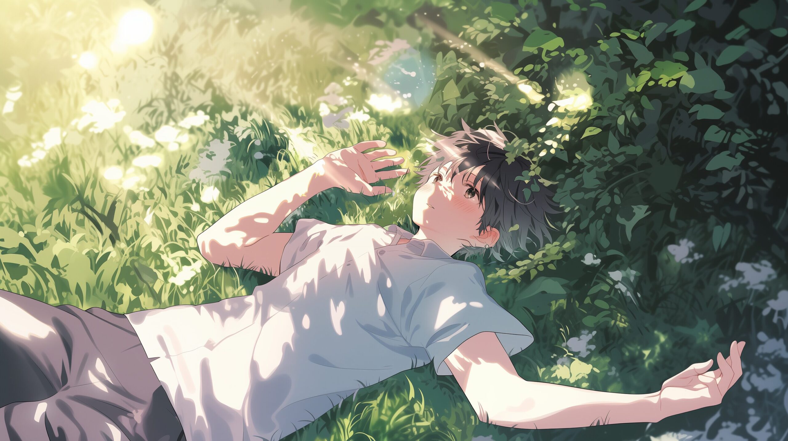 検索タグ:イラスト、ファッション、キャラクター、男性、男、男子、男の子、男の人、アニメ、漫画、マンガ、若い、人物、顔、アート、挿絵、インスタ、Instagram、AI生成画像、fashion、コピースペース、学生、高校生、大学生、夏服、制服、白シャツ、驚き、驚く、青空、晴れ、夏、草むら、草原、横になる、昼寝、考える、寝転がる、リラックス、自然、夏恋、natsukoi