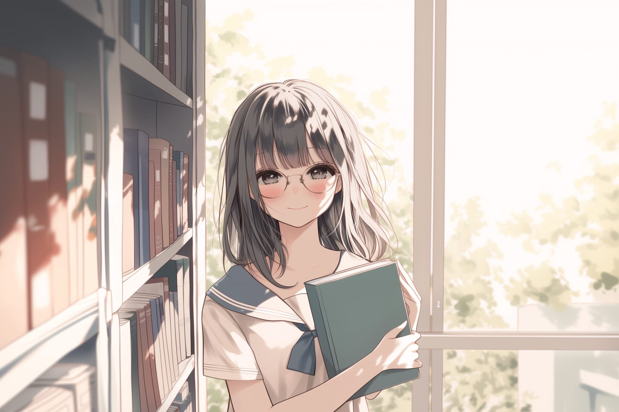 検索タグ:イラスト、ファッション、キャラクター、女性、女、女の子、女子、女の人、アニメ、漫画、マンガ、美人、美女、若い、かわいい、可愛い、カワイイ、人物、顔、美しい、綺麗、きれい、キレイ、アート、お洒落、挿絵、インスタ、Instagram、AI生成画像、fashion、コピースペース、黒髪、眼鏡、めがね、メガネ、本、読書、図書室、図書館、微笑み、笑顔