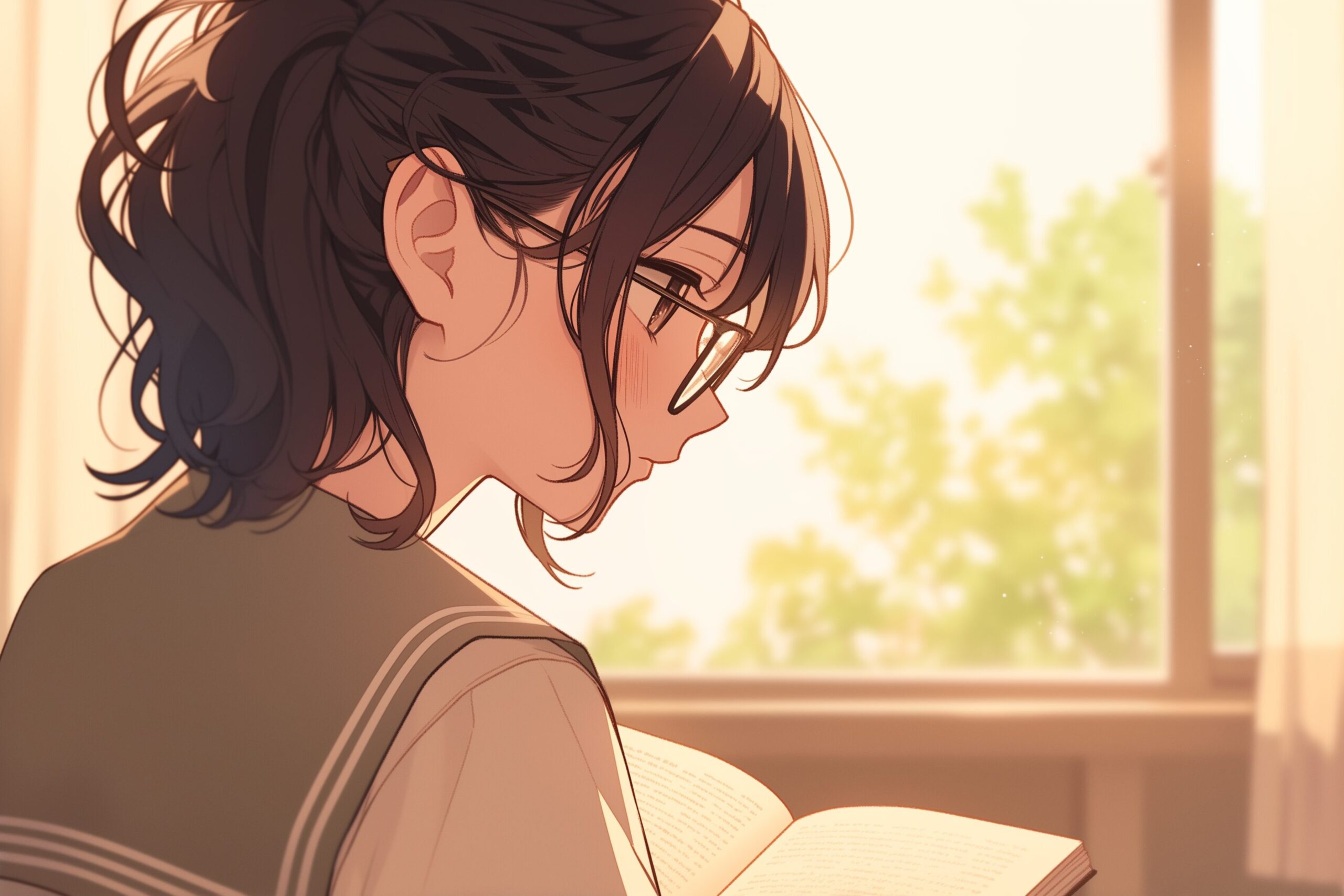 検索タグ:イラスト、ファッション、キャラクター、女性、女、女の子、女子、女の人、アニメ、漫画、マンガ、美人、美女、若い、かわいい、可愛い、カワイイ、人物、顔、美しい、綺麗、きれい、キレイ、アート、お洒落、挿絵、インスタ、Instagram、AI生成画像、fashion、コピースペース、黒髪、眼鏡、めがね、メガネ、本、読書、図書室、図書館、微笑み、笑顔