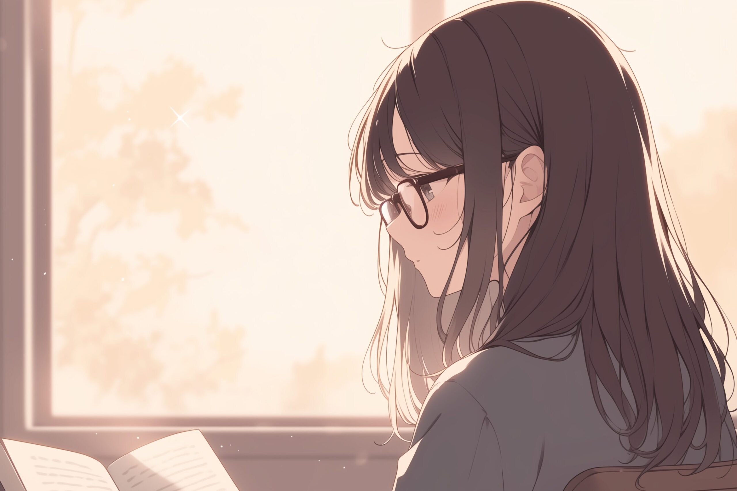 検索タグ:イラスト、ファッション、キャラクター、女性、女、女の子、女子、女の人、アニメ、漫画、マンガ、美人、美女、若い、かわいい、可愛い、カワイイ、人物、顔、美しい、綺麗、きれい、キレイ、アート、お洒落、挿絵、インスタ、Instagram、AI生成画像、fashion、コピースペース、黒髪、眼鏡、めがね、メガネ、本、読書、図書室、図書館、微笑み、笑顔