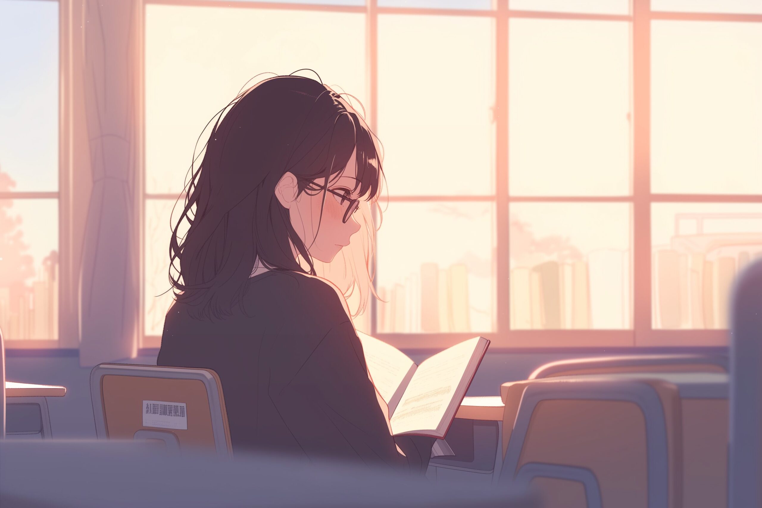 検索タグ:イラスト、ファッション、キャラクター、女性、女、女の子、女子、女の人、アニメ、漫画、マンガ、美人、美女、若い、かわいい、可愛い、カワイイ、人物、顔、美しい、綺麗、きれい、キレイ、アート、お洒落、挿絵、インスタ、Instagram、AI生成画像、fashion、コピースペース、黒髪、眼鏡、めがね、メガネ、本、読書、図書室、図書館、微笑み、笑顔
