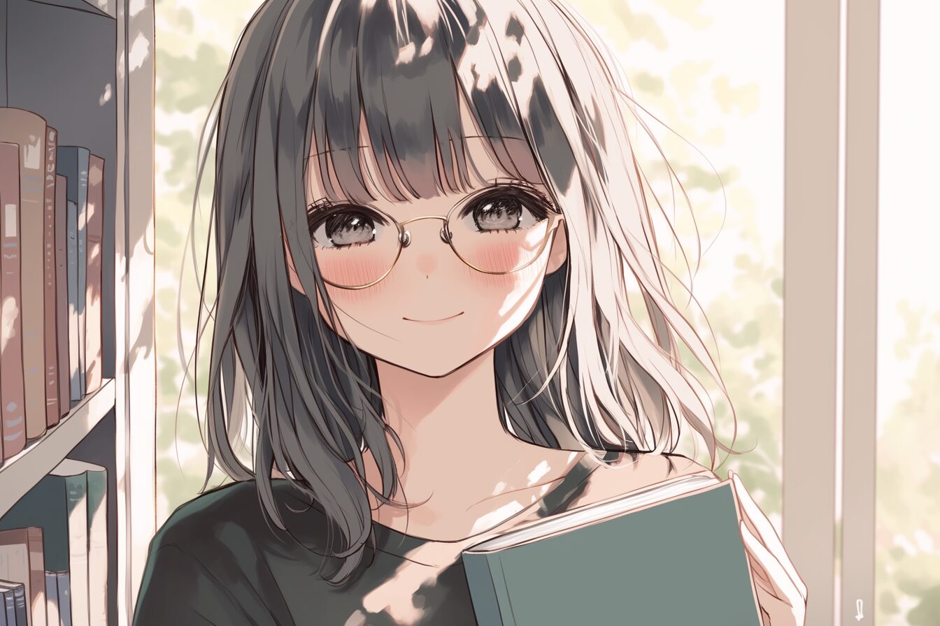 検索タグ:イラスト、ファッション、キャラクター、女性、女、女の子、女子、女の人、アニメ、漫画、マンガ、美人、美女、若い、かわいい、可愛い、カワイイ、人物、顔、美しい、綺麗、きれい、キレイ、アート、お洒落、挿絵、インスタ、Instagram、AI生成画像、fashion、コピースペース、黒髪、眼鏡、めがね、メガネ、本、読書、図書室、図書館、微笑み、笑顔