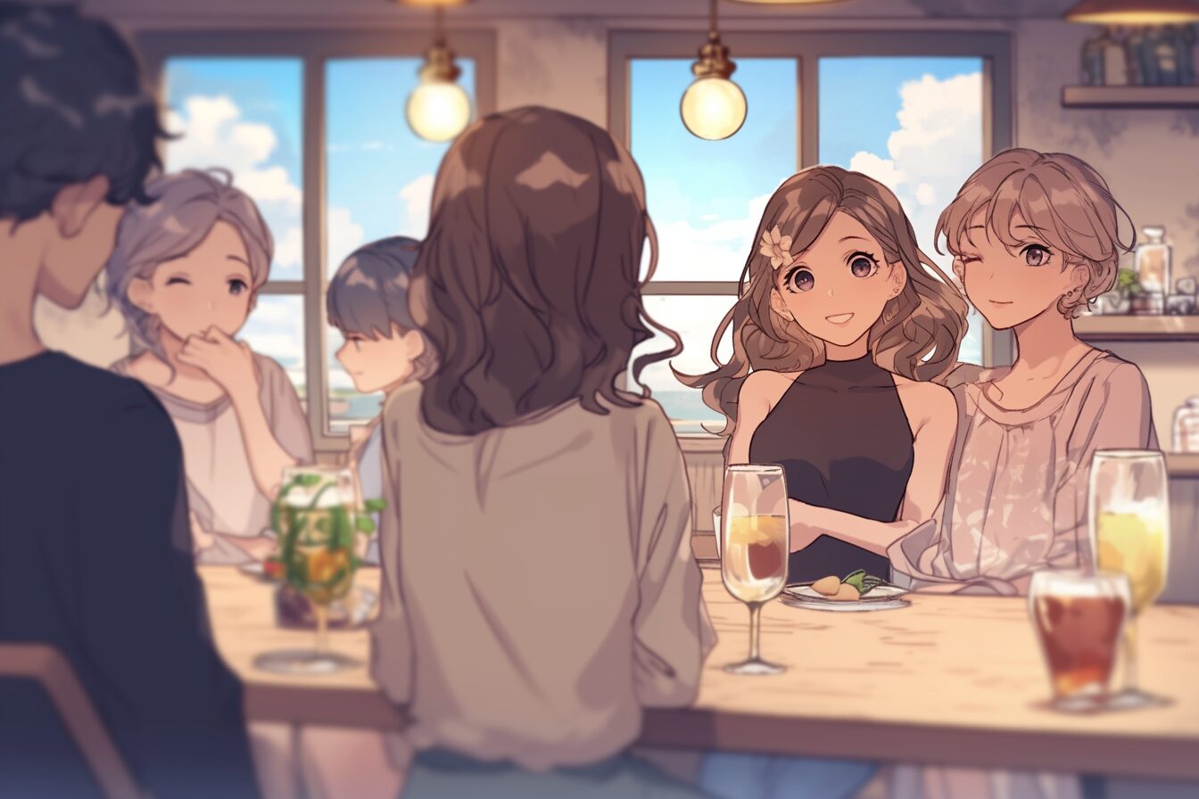 検索タグ:イラスト、AI生成画像、コピースペース、カフェ、飲食店、店内、賑やか、満員、大勢、人気店、お店、レストラン、お客さん、女性客、大盛況、大人気
