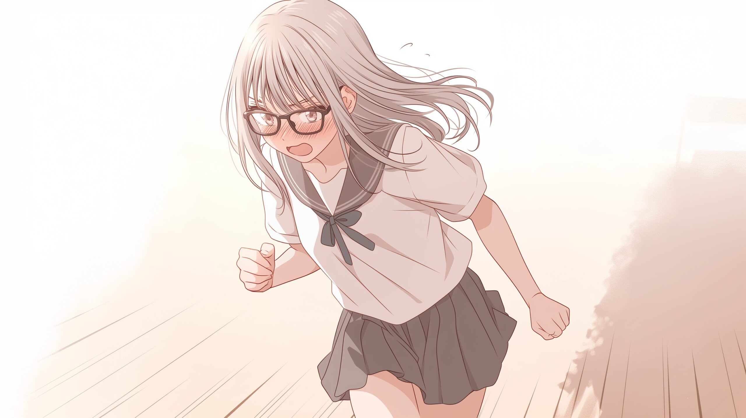 検索タグ:イラスト、ファッション、キャラクター、女性、女、女の子、女子、女の人、アニメ、漫画、マンガ、美人、美女、若い、かわいい、可愛い、カワイイ、人物、顔、美しい、綺麗、きれい、キレイ、アート、お洒落、挿絵、インスタ、Instagram、AI生成画像、fashion、コピースペース、学生、高校生、銀髪、シエ卯バーヘア、眼鏡、メガネ、めがね、走る、ランニング、逃げる、逃げ出す、ダッシュ、恥ずかしい、横長、神様勇気をください