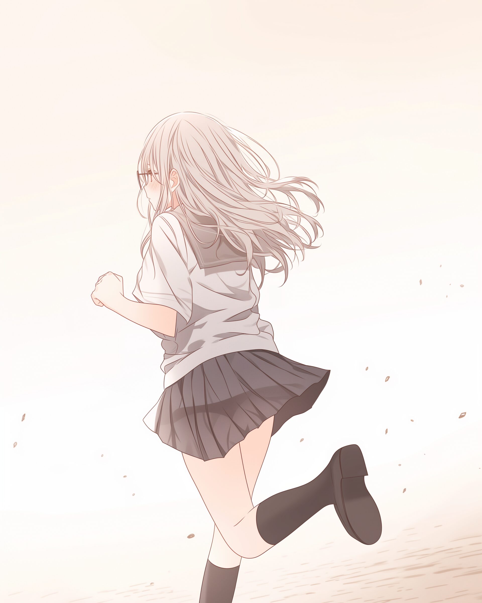 検索タグ:イラスト、ファッション、キャラクター、女性、女、女の子、女子、女の人、アニメ、漫画、マンガ、美人、美女、若い、かわいい、可愛い、カワイイ、人物、顔、美しい、綺麗、きれい、キレイ、アート、お洒落、挿絵、インスタ、Instagram、AI生成画像、fashion、コピースペース、学生、高校生、銀髪、シエ卯バーヘア、眼鏡、メガネ、めがね、走る、ランニング、逃げる、逃げ出す、ダッシュ、恥ずかしい、後ろ姿、神様勇気をください