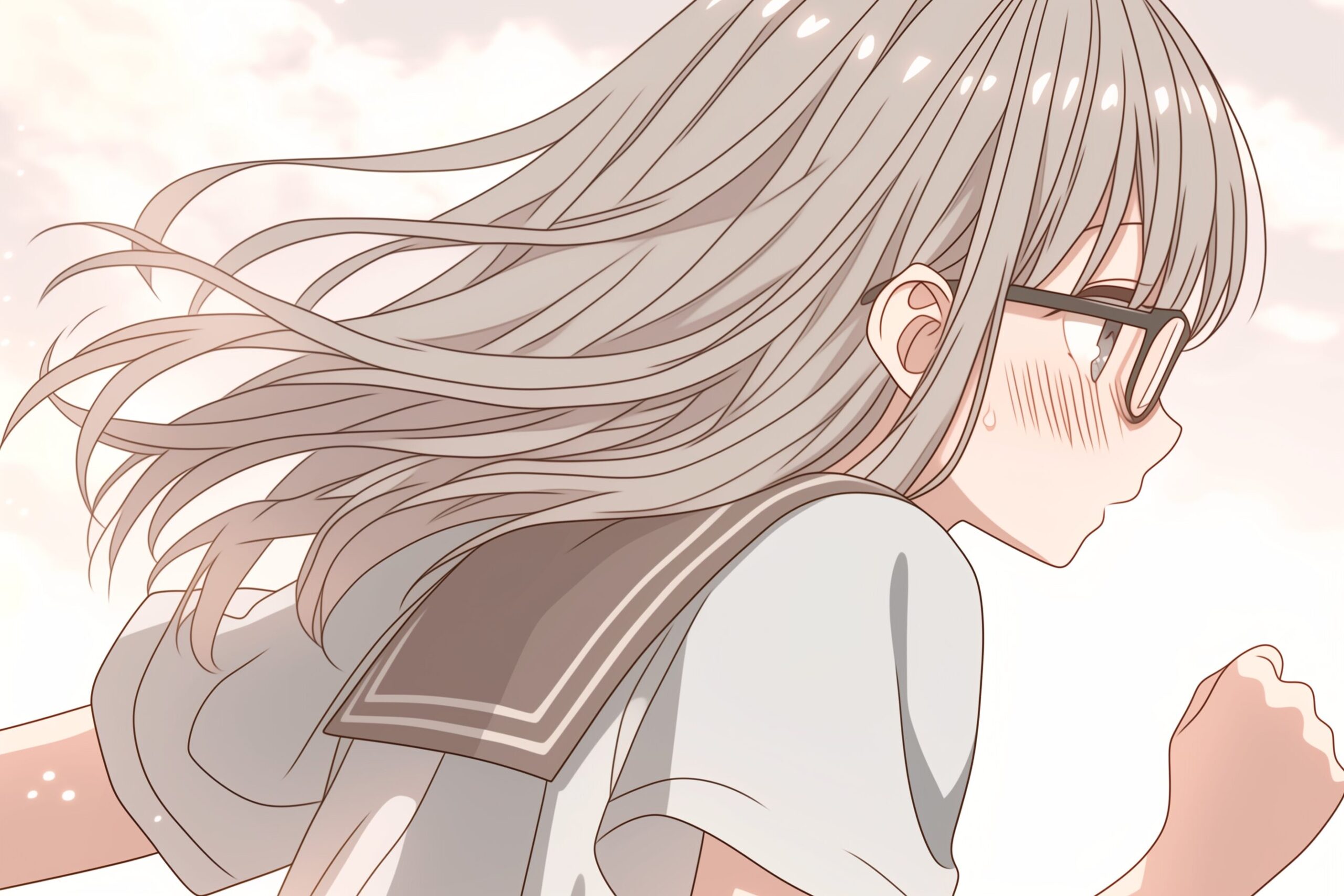 検索タグ:イラスト、ファッション、キャラクター、女性、女、女の子、女子、女の人、アニメ、漫画、マンガ、美人、美女、若い、かわいい、可愛い、カワイイ、人物、顔、美しい、綺麗、きれい、キレイ、アート、お洒落、挿絵、インスタ、Instagram、AI生成画像、fashion、コピースペース、学生、高校生、銀髪、シエ卯バーヘア、眼鏡、メガネ、めがね、走る、ランニング、逃げる、逃げ出す、ダッシュ、恥ずかしい、横顔、、神様勇気をください