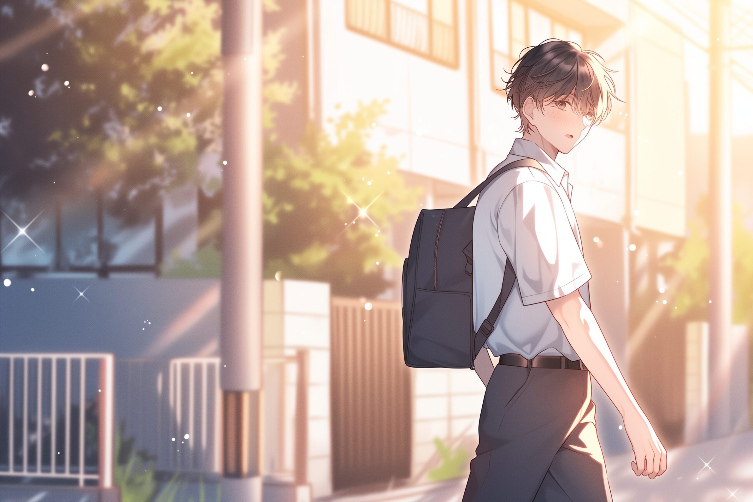 検索タグ:イラスト、ファッション、キャラクター、男性、男、男子、男の子、男の人、アニメ、漫画、マンガ、若い、人物、顔、アート、挿絵、インスタ、Instagram、AI生成画像、fashion、コピースペース、学生、高校生、寝起き、通学、振り返る、振り向く、リュックサック、歩く、徒歩、全身