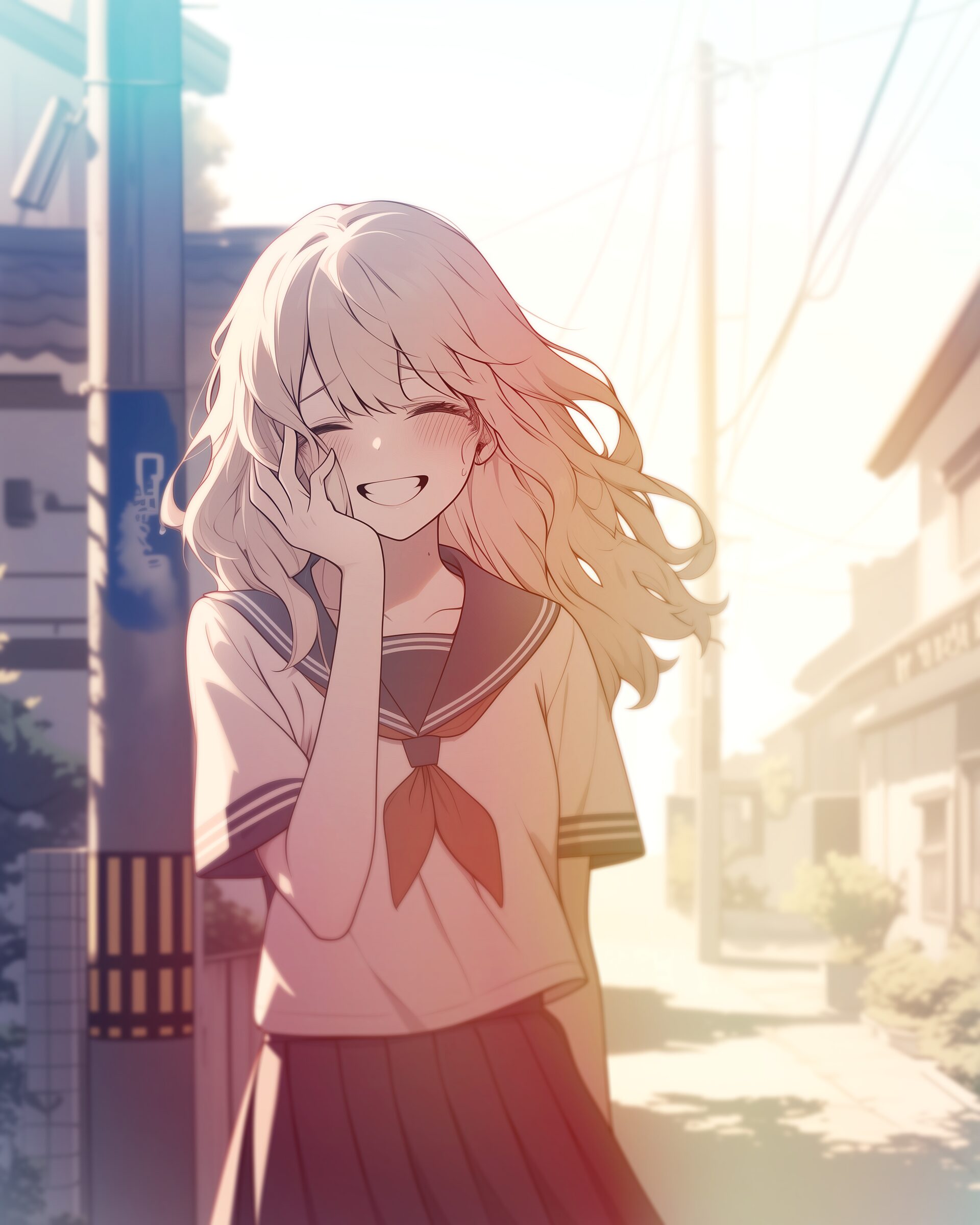 検索タグ:イラスト、ファッション、キャラクター、女性、女、女の子、女子、女の人、アニメ、漫画、マンガ、美人、美女、若い、かわいい、可愛い、カワイイ、人物、顔、美しい、綺麗、きれい、キレイ、アート、お洒落、挿絵、インスタ、Instagram、AI生成画像、fashion、コピースペース、恋愛、恋、エモい、夏、笑顔、サマー、二人、2人、神尾麗奈、kamio reina、金髪、制服、セーラー服、JK、路地、田舎道、振り返る