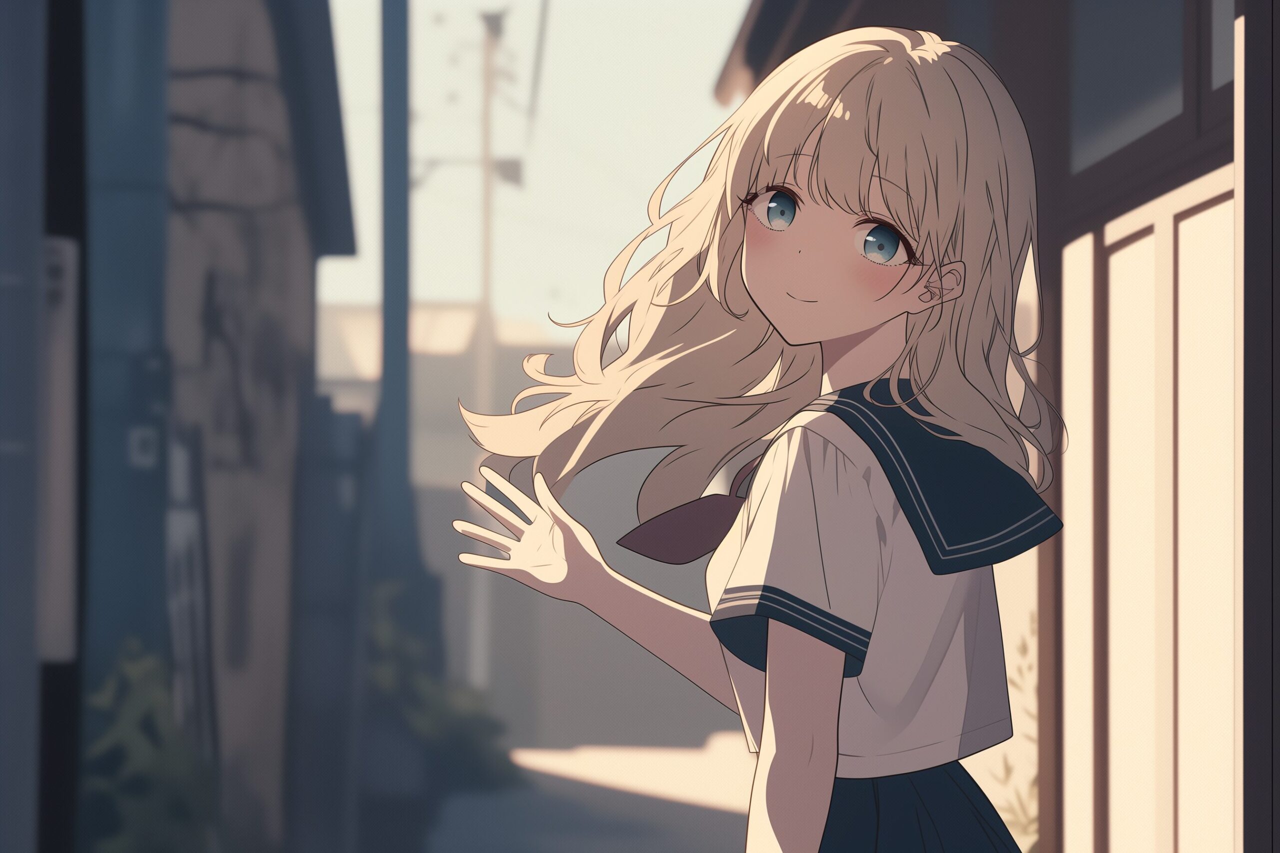 検索タグ:イラスト、ファッション、キャラクター、女性、女、女の子、女子、女の人、アニメ、漫画、マンガ、美人、美女、若い、かわいい、可愛い、カワイイ、人物、顔、美しい、綺麗、きれい、キレイ、アート、お洒落、挿絵、インスタ、Instagram、AI生成画像、fashion、コピースペース、恋愛、恋、エモい、夏、笑顔、サマー、二人、2人、神尾麗奈、kamio reina、金髪、制服、セーラー服、JK、路地、田舎道、振り返る、振り向く、手を振る、バイバイ、さよなら、ばいばい