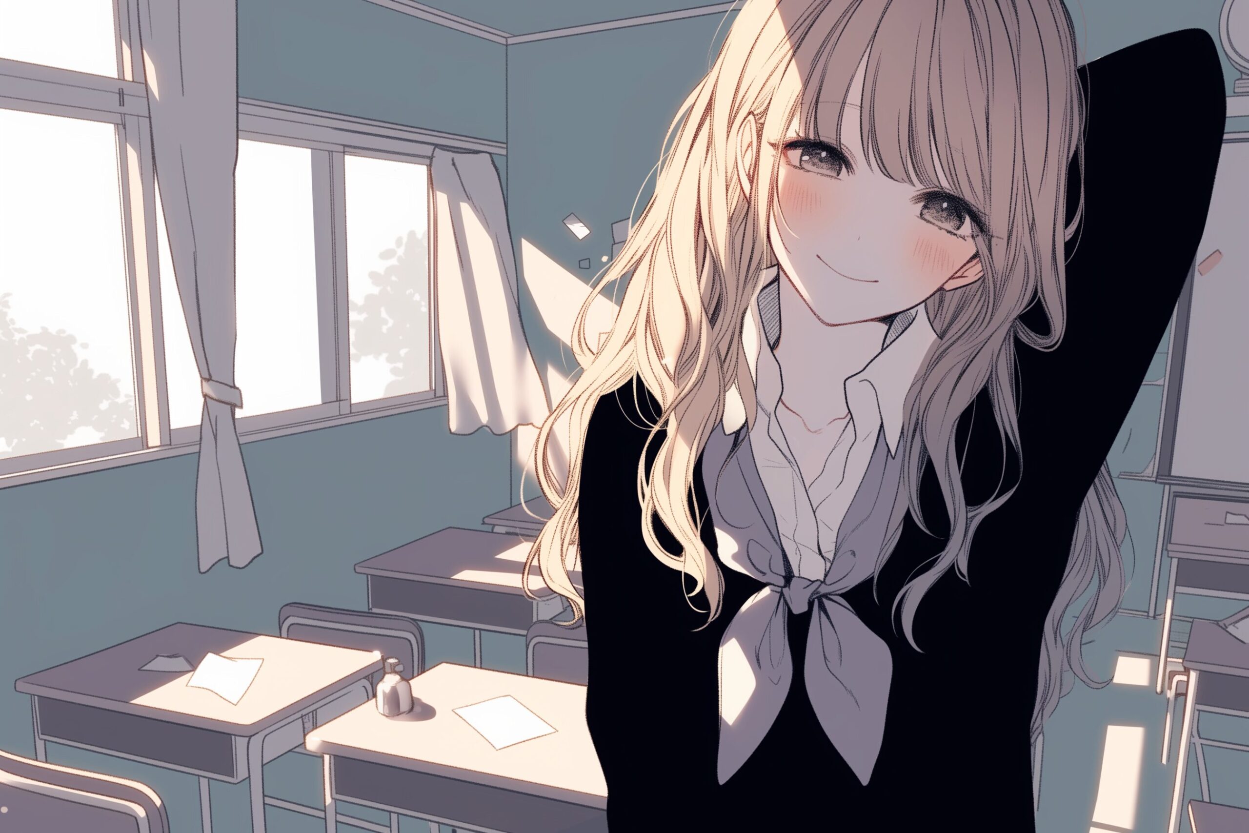 検索タグ:イラスト、キャラクター、女性、女、女の子、女子、女の人、アニメ、漫画、マンガ、美人、美女、若い、かわいい、可愛い、カワイイ、人物、顔、美しい、綺麗、きれい、キレイ、アート、お洒落、挿絵、インスタ、Instagram、AI生成画像、コピースペース、恥ずかしい、照れる、学校、制服、金髪、ブロンドヘア、切ない、エモい
