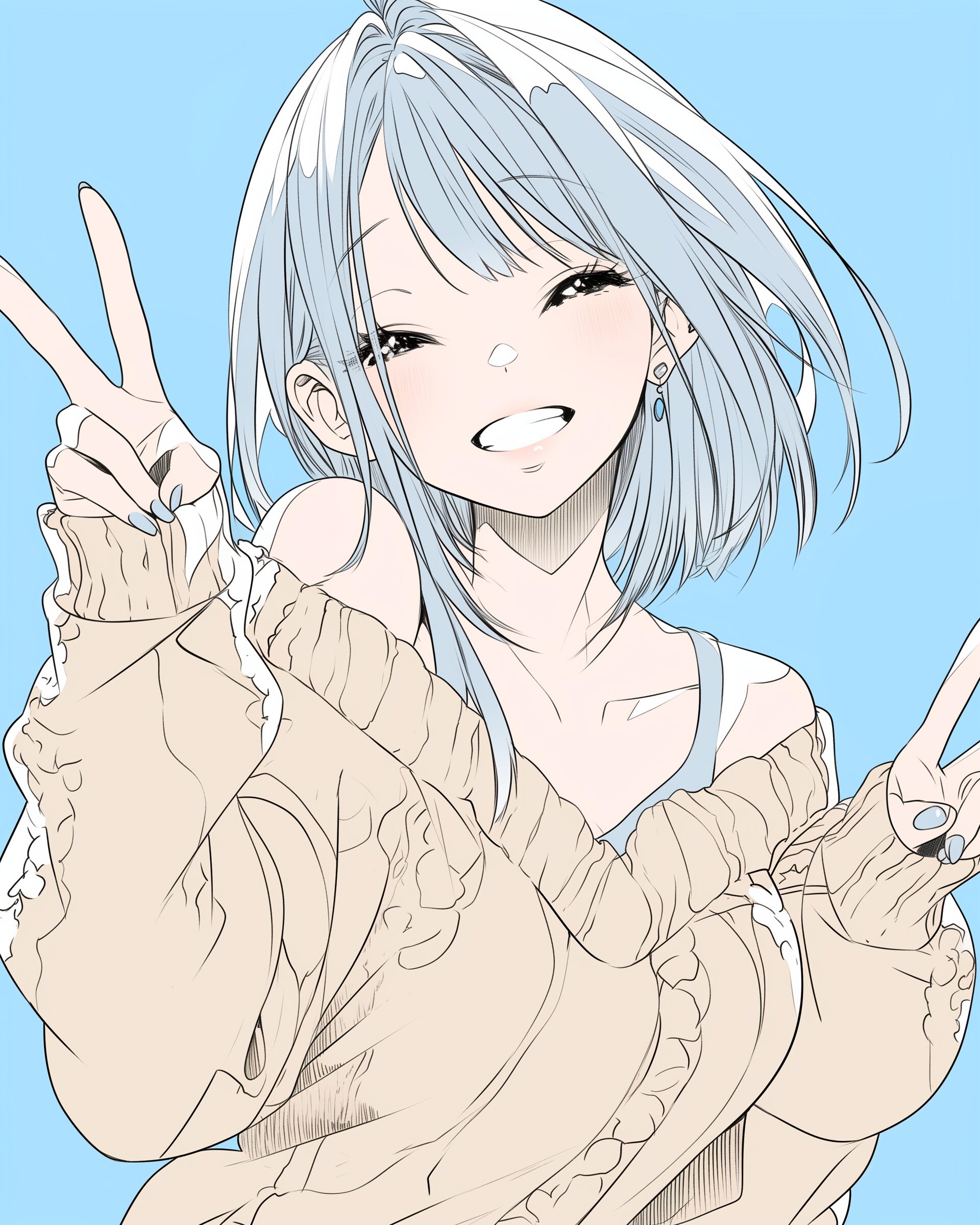 検索タグ:イラスト、ファッション、キャラクター、女性、女、女の子、女子、女の人、アニメ、漫画、マンガ、美人、美女、若い、かわいい、可愛い、カワイイ、人物、顔、美しい、綺麗、きれい、キレイ、アート、お洒落、挿絵、インスタ、Instagram、AI生成画像、fashion、コピースペース、銀髪、笑顔、パーカー女子、ピース