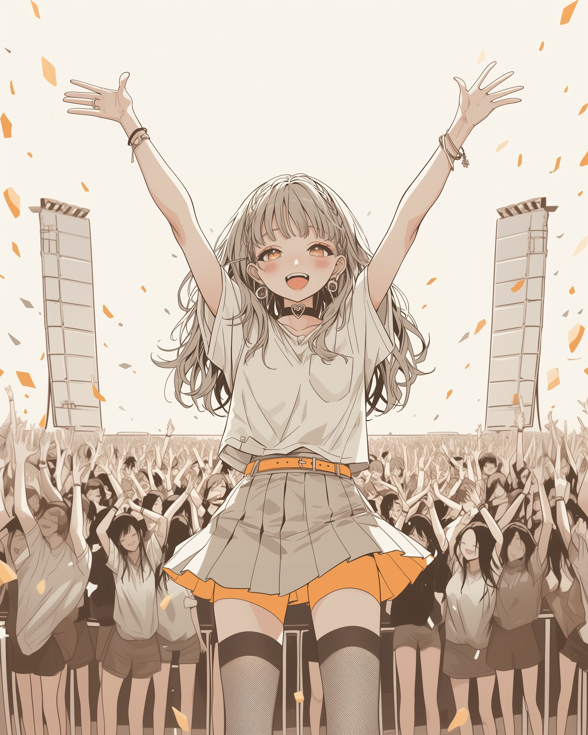 検索タグ:イラスト、ファッション、キャラクター、女性、女、女の子、女子、女の人、アニメ、漫画、マンガ、美人、美女、若い、かわいい、可愛い、カワイイ、人物、顔、美しい、綺麗、きれい、キレイ、アート、お洒落、挿絵、インスタ、Instagram、AI生成画像、fashion、コピースペース、銀髪、笑顔、ライブ、コンサート、アーティスト、歌手、LIVE