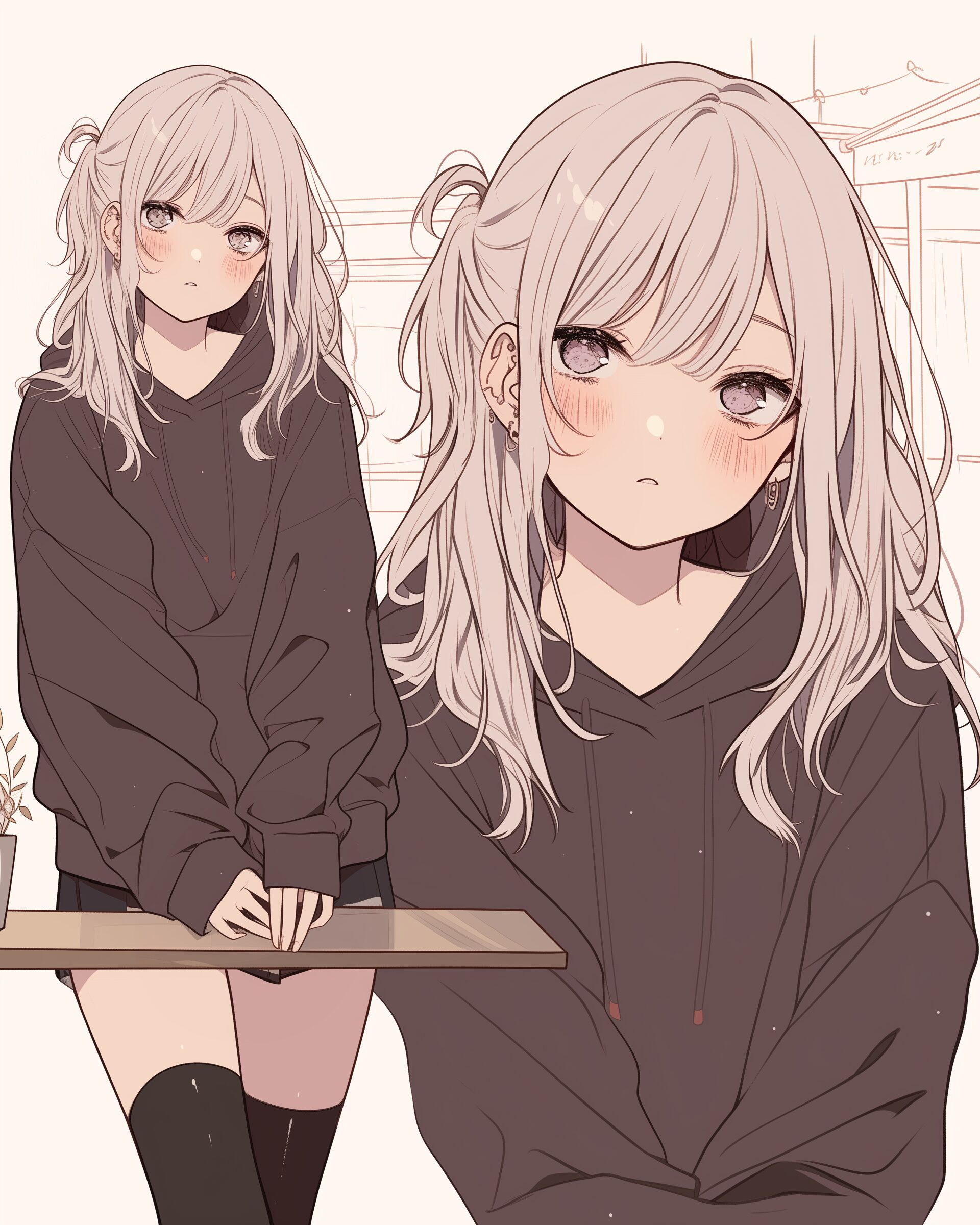 検索タグ:イラスト、ファッション、キャラクター、女性、女、女の子、女子、女の人、アニメ、漫画、マンガ、美人、美女、若い、かわいい、可愛い、カワイイ、人物、顔、美しい、綺麗、きれい、キレイ、アート、お洒落、挿絵、インスタ、Instagram、AI生成画像、fashion、コピースペース、おしゃれ、オシャレ、秋、秋服、パーカー女子、銀髪、シルバーヘア