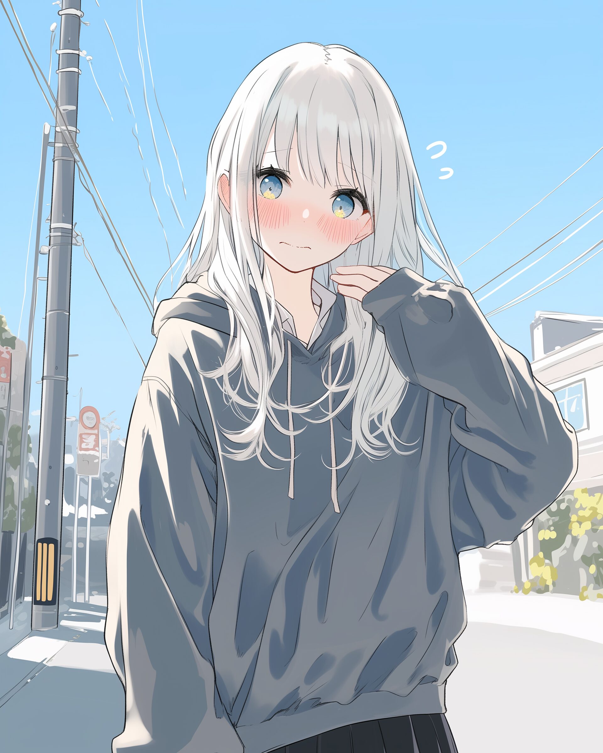検索タグ:イラスト、ファッション、キャラクター、女性、女、女の子、女子、女の人、アニメ、漫画、マンガ、美人、美女、若い、かわいい、可愛い、カワイイ、人物、顔、美しい、綺麗、きれい、キレイ、アート、お洒落、挿絵、インスタ、Instagram、AI生成画像、fashion、コピースペース、銀髪、パーカー女子、恥ずかしい、照れる、照れくさい、緊張