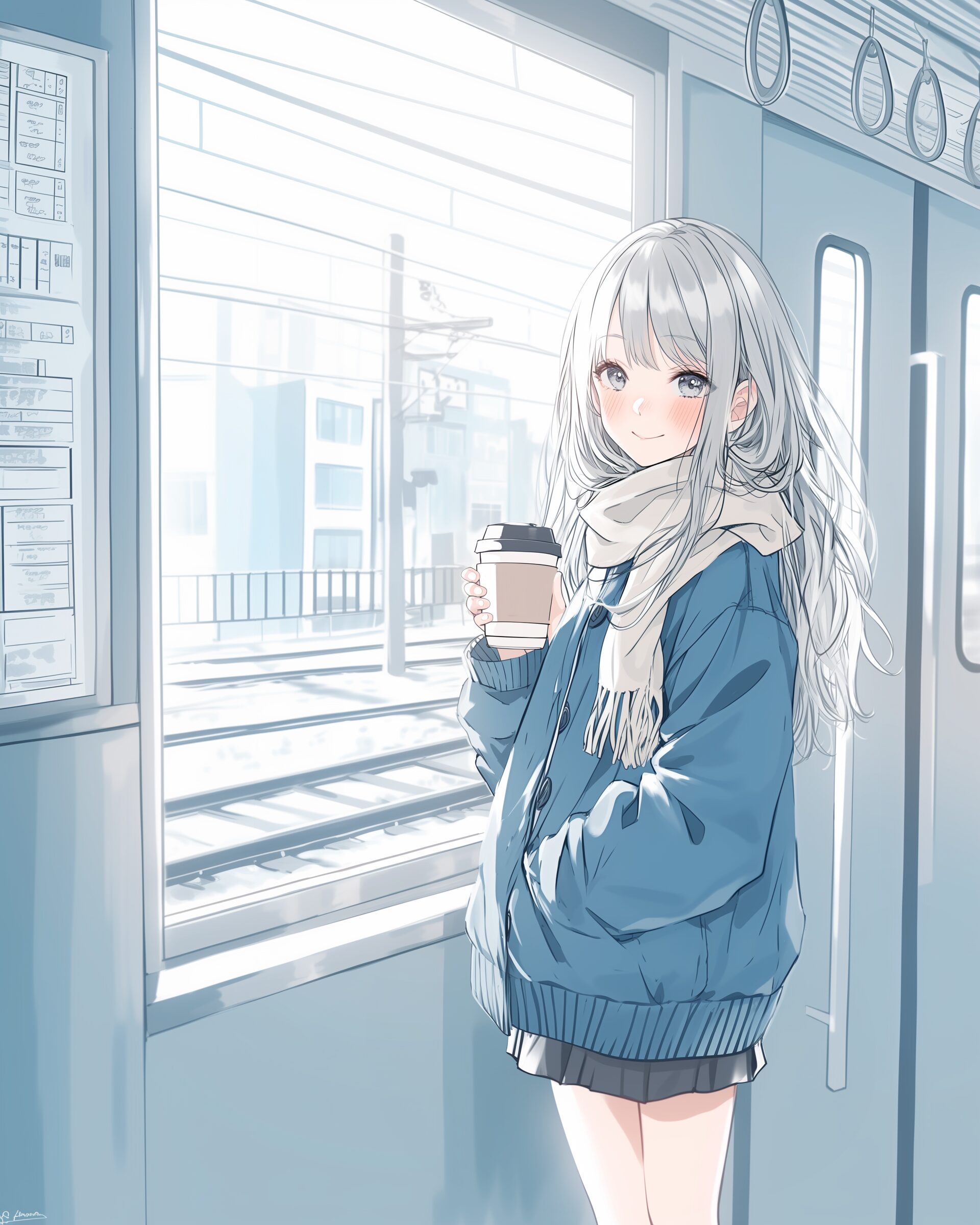 検索タグ:イラスト、ファッション、キャラクター、女性、女、女の子、女子、女の人、アニメ、漫画、マンガ、美人、美女、若い、かわいい、可愛い、カワイイ、人物、顔、美しい、綺麗、きれい、キレイ、アート、お洒落、挿絵、インスタ、Instagram、AI生成画像、fashion、コピースペース、銀髪、笑顔、電車、ホットコーヒー、通学、帰宅