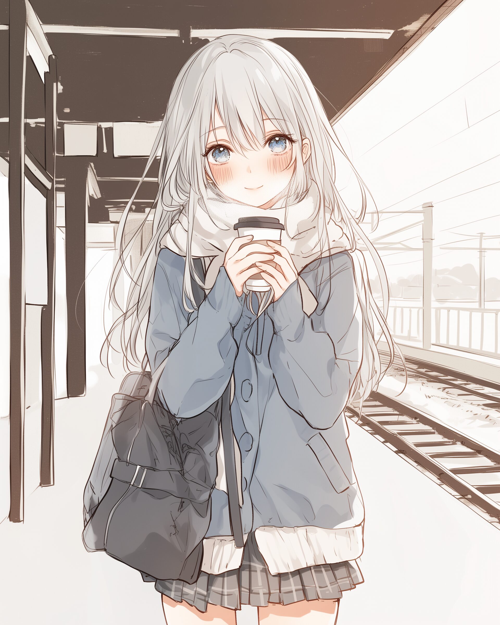 検索タグ:イラスト、ファッション、キャラクター、女性、女、女の子、女子、女の人、アニメ、漫画、マンガ、美人、美女、若い、かわいい、可愛い、カワイイ、人物、顔、美しい、綺麗、きれい、キレイ、アート、お洒落、挿絵、インスタ、Instagram、AI生成画像、fashion、コピースペース、銀髪、笑顔、電車、通学、帰宅、ペットボトル