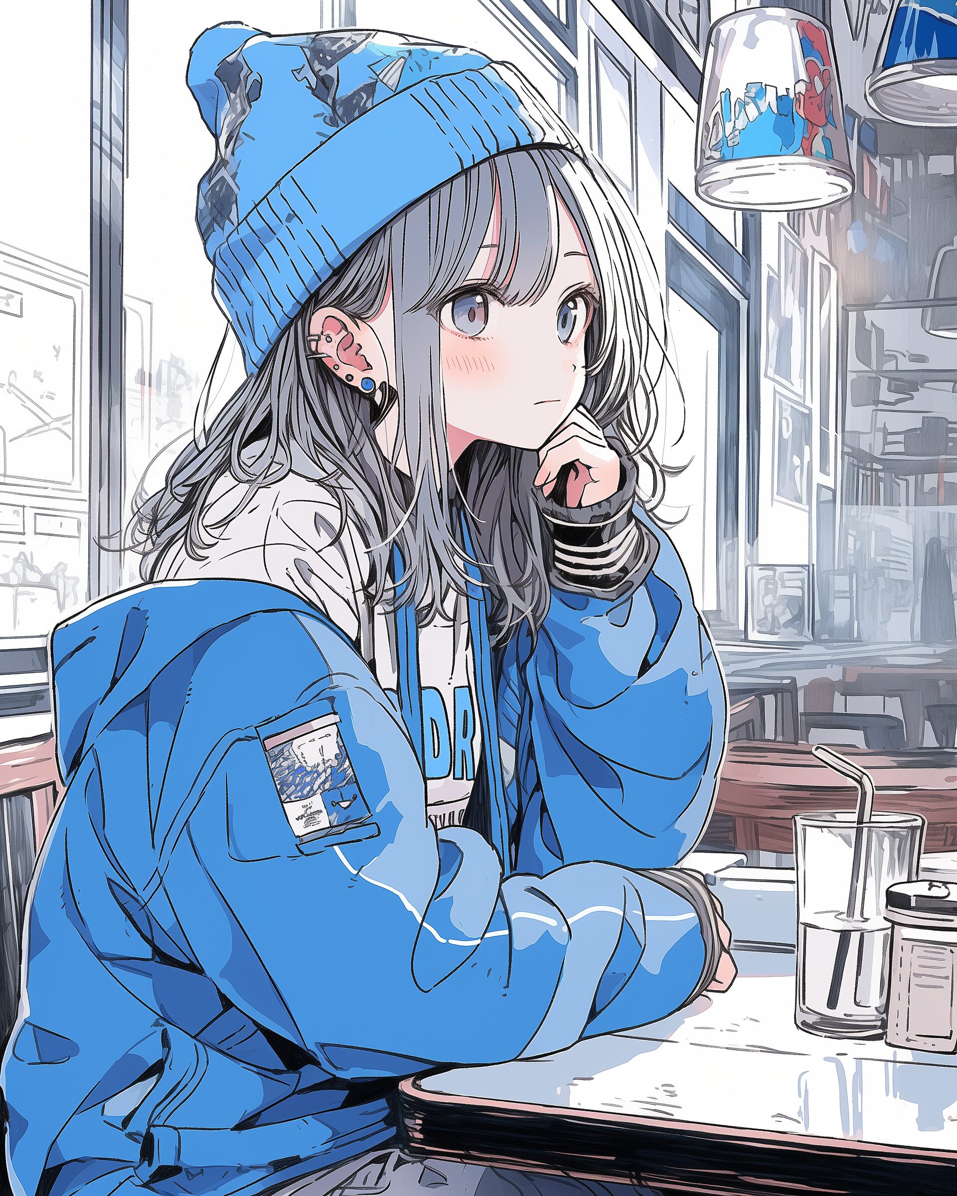 検索タグ:イラスト、ファッション、キャラクター、女性、女、女の子、女子、女の人、アニメ、漫画、マンガ、美人、美女、若い、かわいい、可愛い、カワイイ、萌え、萌え系、萌えキャラ、人物、顔、美しい、綺麗、きれい、キレイ、芸術、アート、顔、冬服、冬、洋服、お洒落、おしゃれ、オシャレ、コーデ、コーディネート、キュート、女子高生、JK、ジャケット、青、ブルー、スウェット