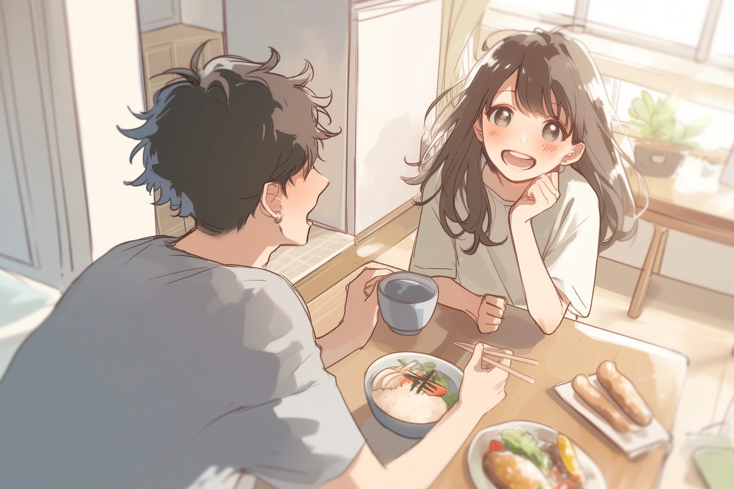 検索タグ:イラスト、ファッション、キャラクター、女性、女、女の子、女子、女の人、アニメ、漫画、マンガ、美人、美女、若い、かわいい、可愛い、カワイイ、人物、顔、美しい、綺麗、きれい、キレイ、アート、お洒落、挿絵、インスタ、Instagram、AI生成画像、コピースペース、カップル、恋人、愛、恋、恋愛、黒髪、笑顔、仲良し、男、男性、夫婦、寄り添う、食卓、食事、団欒