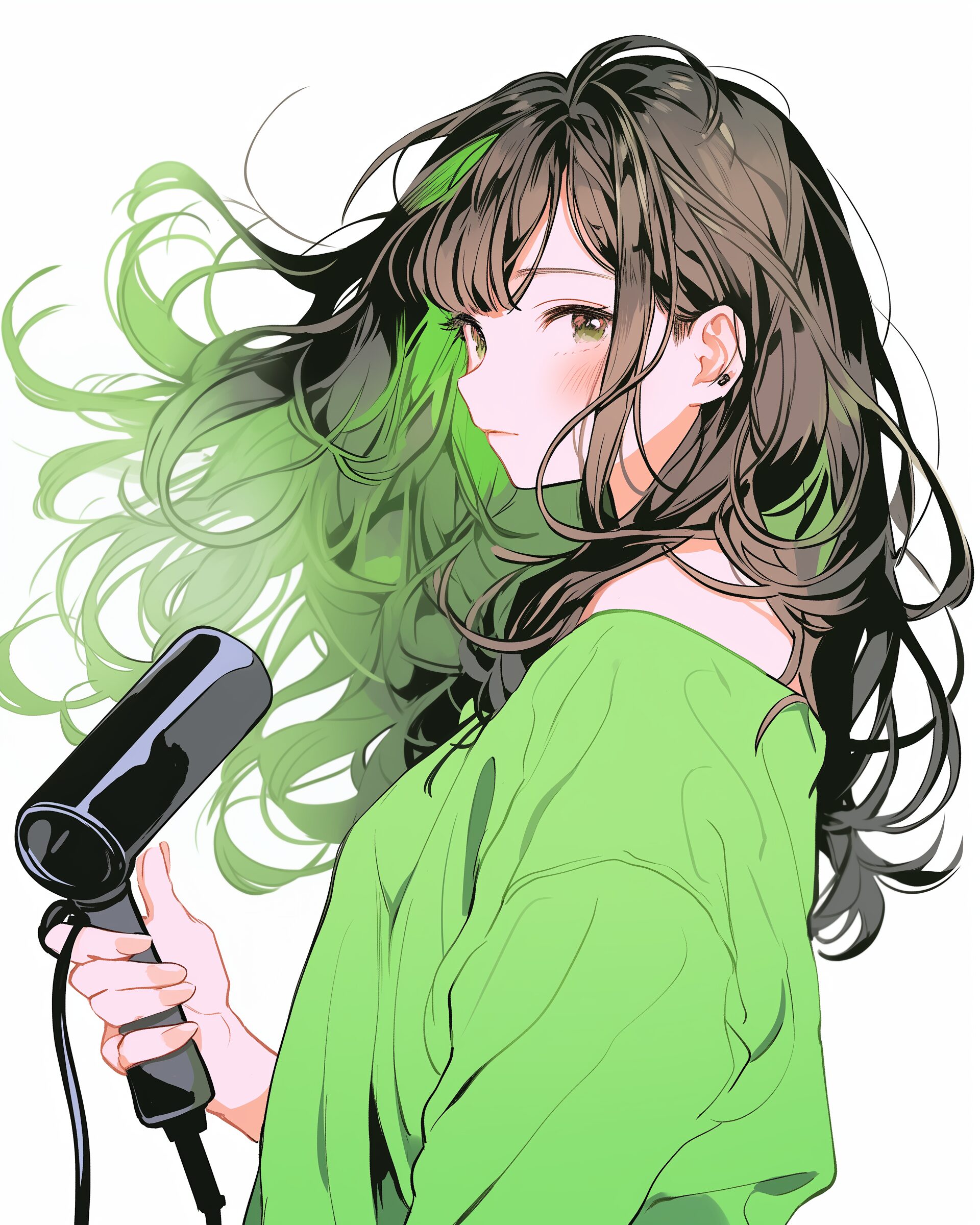 検索タグ:イラスト、ファッション、キャラクター、女性、女、女の子、女子、女の人、アニメ、漫画、マンガ、美人、美女、若い、かわいい、可愛い、カワイイ、人物、顔、美しい、綺麗、きれい、キレイ、アート、お洒落、女子高生、JK、挿絵、夏、春、パステルカラー、春服、インスタ、Instagram、ドライヤー、髪を乾かす、笑顔、緑、グリーン、Green