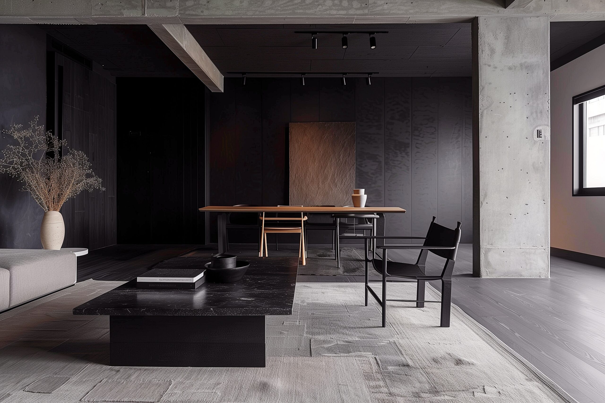 検索タグ:黒、ブラック・部屋・家具・インテリア・おしゃれ・オシャレ・お洒落・部屋・室内・物件・不動産・内観・内装・屋内・リフォーム・リノベーション・コピースペース・ポストカード・フリー素材・モデルルーム・リビング・ZOOM背景・イメージ・デザイン・リノベ・引っ越し・引越し・転居・リビング・リビングルーム・ソファ、ダイニング、ダイニングテーブル、木のテーブル、インテリアデザイン、かっこいい