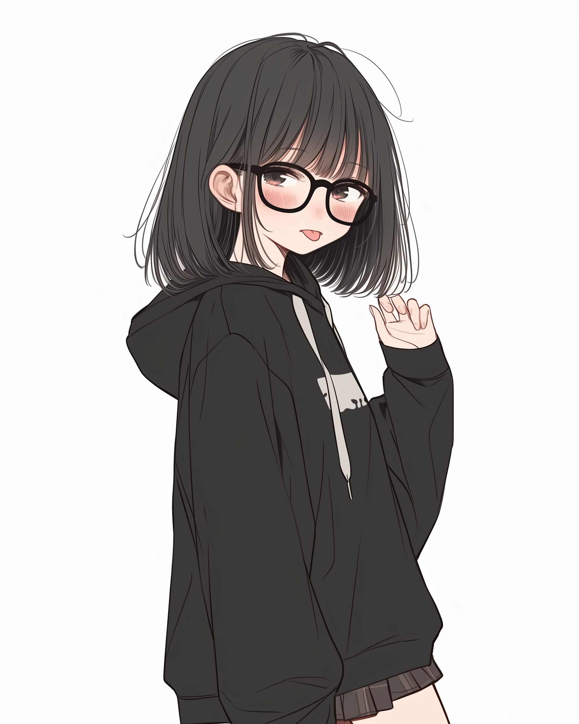 検索タグ:イラスト、キャラクター、女子、女の子、女性、女、女の人、アニメ、漫画、マンガ、若い、人物、顔、美しい、綺麗、きれい、キレイ、アート、お洒落、挿絵、インスタ、Instagram、AI生成画像、コピースペース、かわいい、可愛い、カワイイ、黒髪、橘、たちばな、ゆず、柚、キャラクター、ショートヘア、黒髪、メガネ、眼鏡、めがね、前髪ぱっつん、パッツン、パーカー女子、黒、ブラック、全身、コーディネート、ファッション