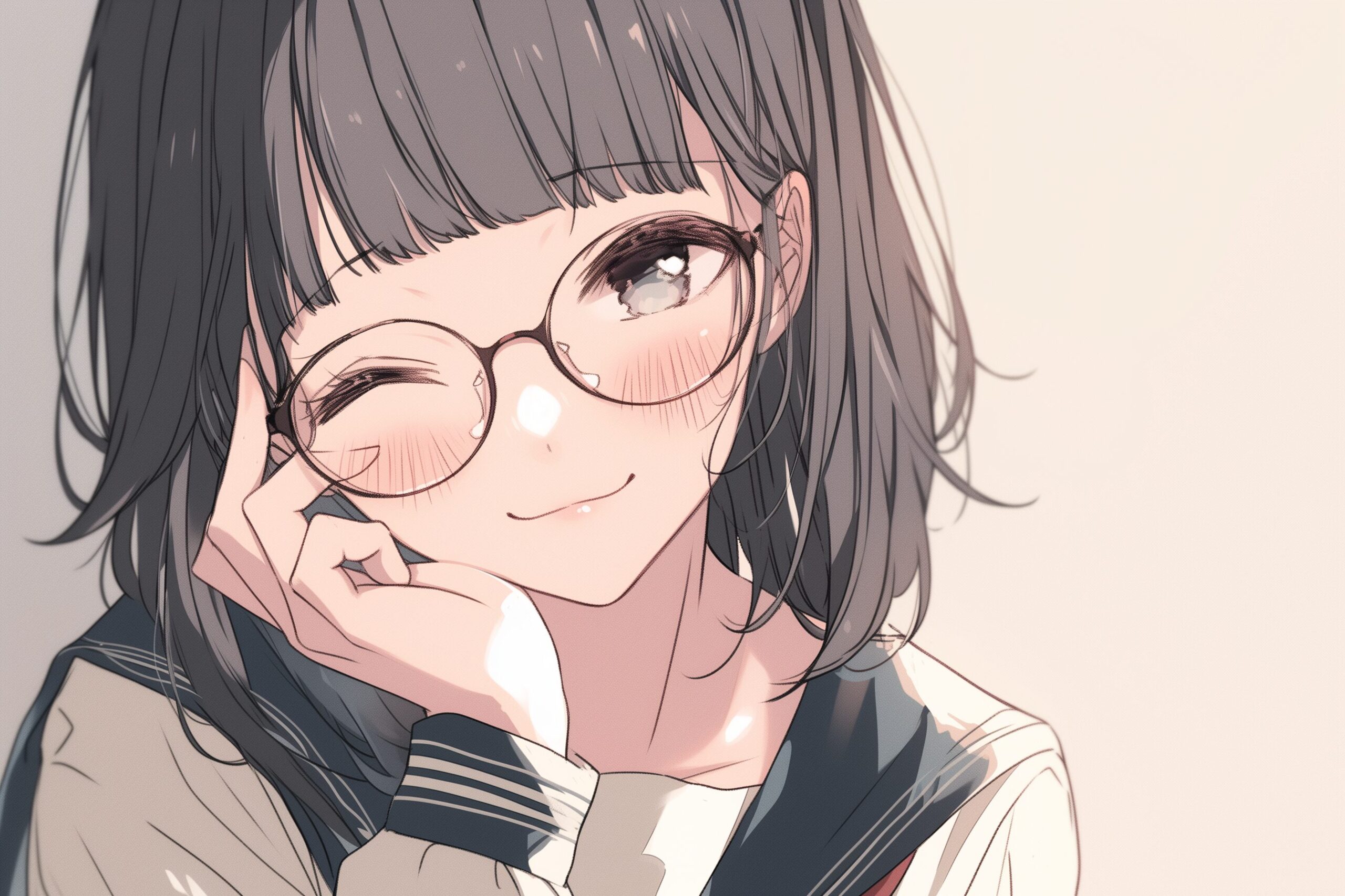 検索タグ:イラスト、キャラクター、女子、女の子、女性、女、女の人、アニメ、漫画、マンガ、若い、人物、顔、美しい、綺麗、きれい、キレイ、アート、お洒落、挿絵、インスタ、Instagram、AI生成画像、コピースペース、恋愛、恋、かわいい、可愛い、カワイイ、制服、ロングヘア、高校生、学生、セーラー服、笑顔、微笑み、微笑む、黒髪、ぱっつん、前髪、パッツン、ショートヘア、ボブヘア、おかっぱ、めがね、眼鏡、メガネ、ウインク