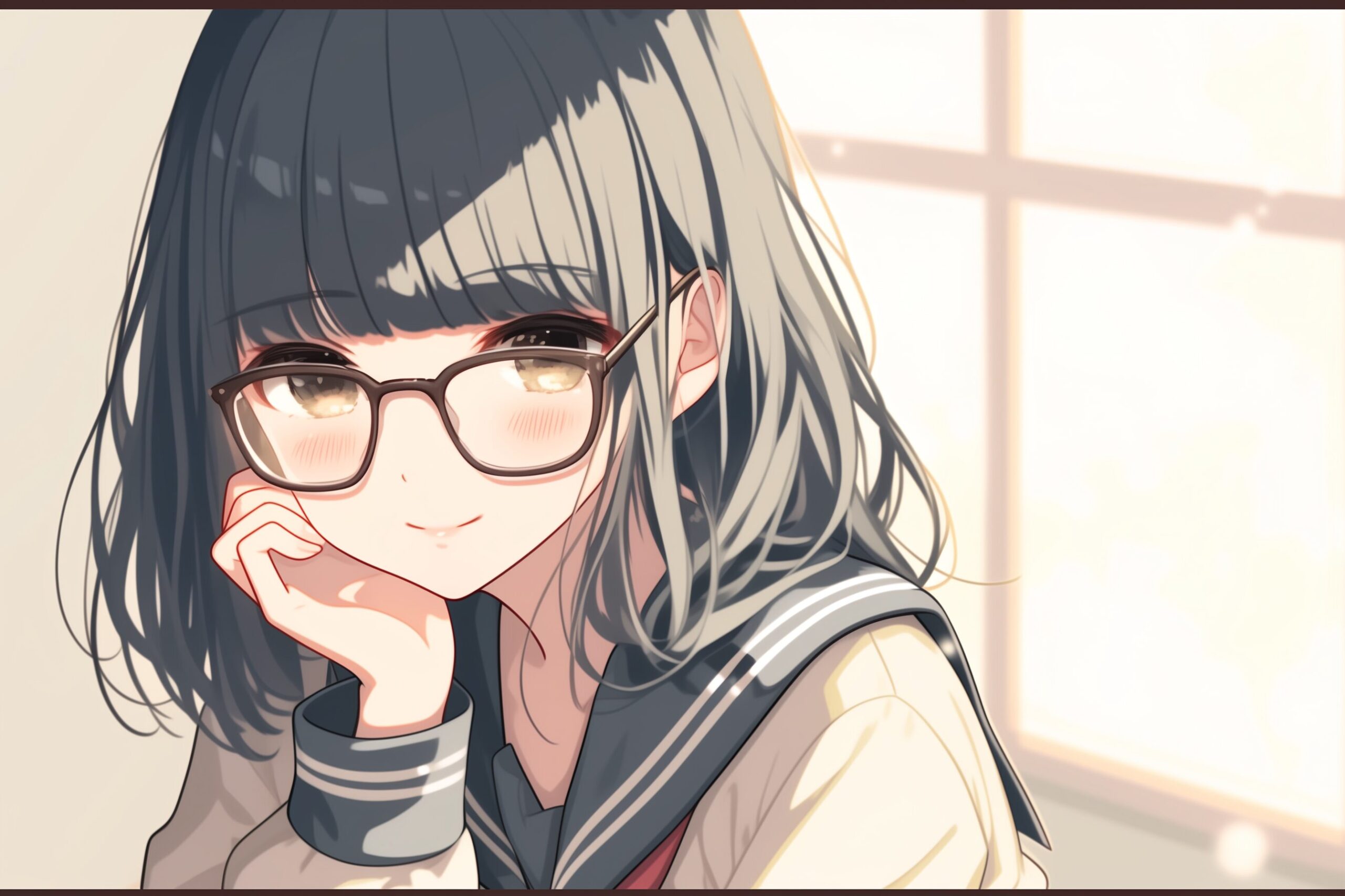 検索タグ:イラスト、キャラクター、女子、女の子、女性、女、女の人、アニメ、漫画、マンガ、若い、人物、顔、美しい、綺麗、きれい、キレイ、アート、お洒落、挿絵、インスタ、Instagram、AI生成画像、コピースペース、恋愛、恋、かわいい、可愛い、カワイイ、制服、ロングヘア、高校生、学生、セーラー服、笑顔、微笑み、微笑む、黒髪、ぱっつん、前髪、パッツン、ショートヘア、ボブヘア、おかっぱ、めがね、眼鏡、メガネ、橘、柚、ゆず、たちばな、キャラクター