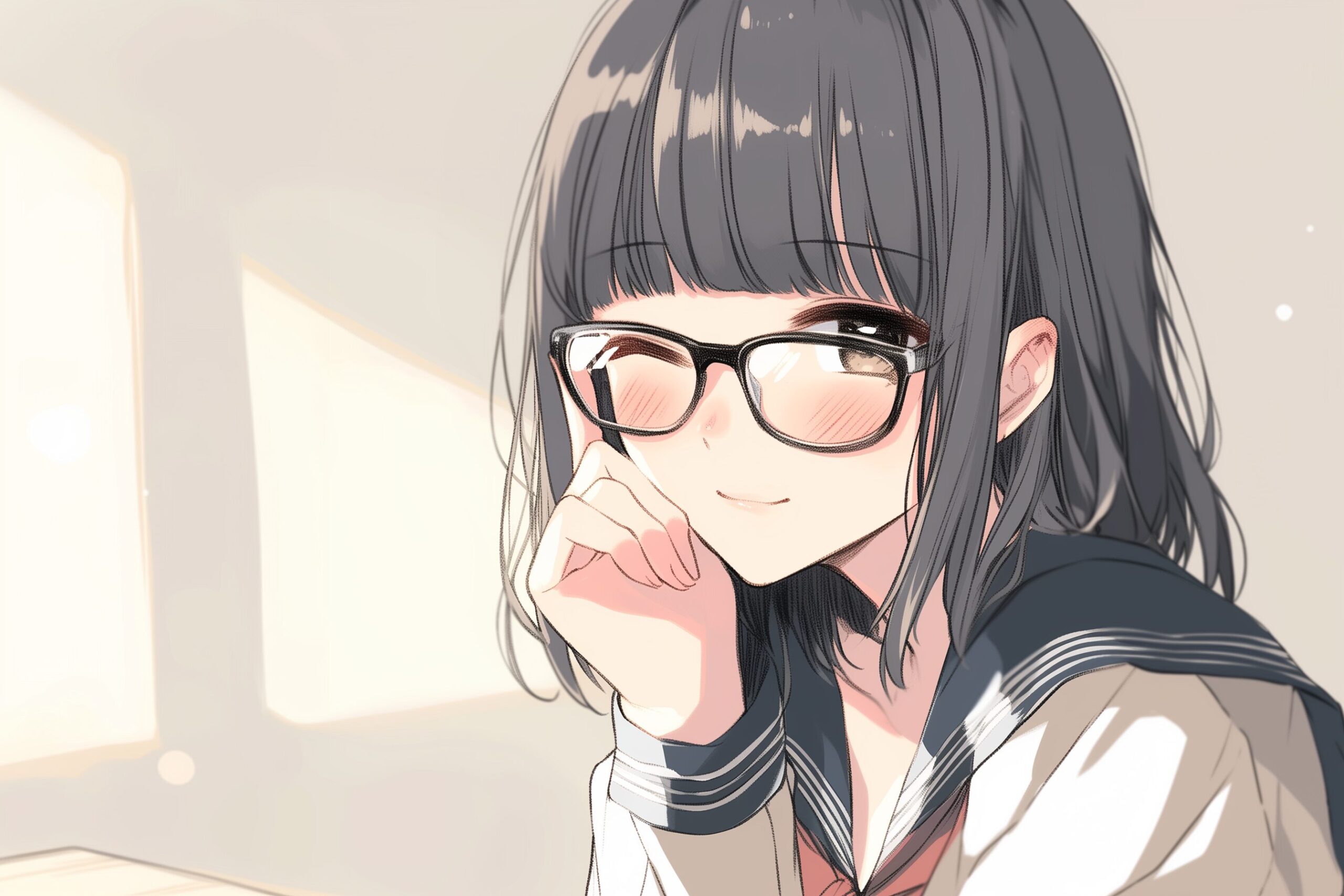 検索タグ:イラスト、キャラクター、女子、女の子、女性、女、女の人、アニメ、漫画、マンガ、若い、人物、顔、美しい、綺麗、きれい、キレイ、アート、お洒落、挿絵、インスタ、Instagram、AI生成画像、コピースペース、恋愛、恋、かわいい、可愛い、カワイイ、制服、ロングヘア、高校生、学生、セーラー服、笑顔、微笑み、微笑む、黒髪、ぱっつん、前髪、パッツン、ショートヘア、ボブヘア、おかっぱ、めがね、眼鏡、メガネ、橘、柚、ゆず、たちばな、キャラクター