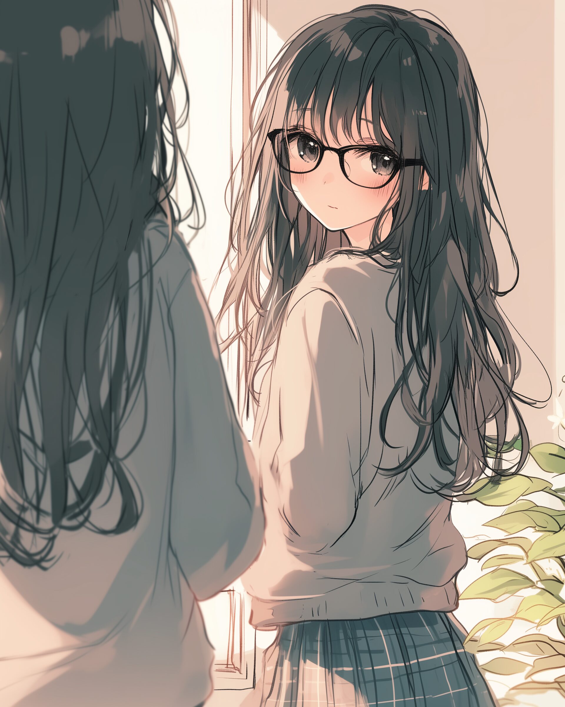検索タグ:イラスト、キャラクター、女性、女、女の人、アニメ、漫画、マンガ、若い、人物、顔、美しい、綺麗、きれい、キレイ、アート、お洒落、挿絵、インスタ、Instagram、AI生成画像、コピースペース、美女、美人、可愛い、かわいい、kawaii、黒髪、ロングヘア、髪型、長い髪、めがね、眼鏡、メガネ