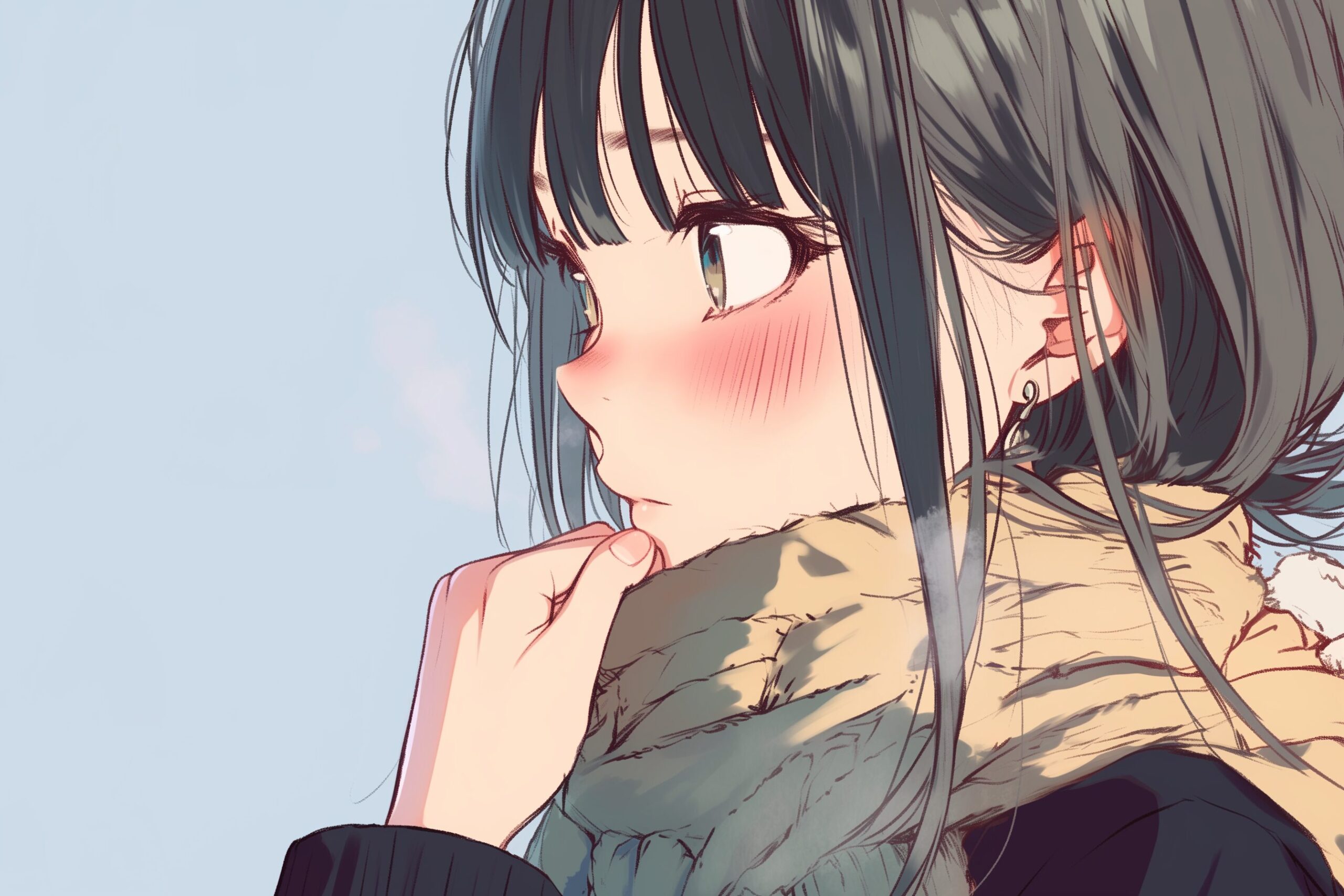 検索タグ:イラスト、キャラクター、女性、女、女の子、女子、女の人、アニメ、漫画、マンガ、美人、美女、若い、かわいい、可愛い、カワイイ、人物、顔、美しい、綺麗、きれい、キレイ、アート、お洒落、挿絵、インスタ、Instagram、AI生成画像、コピースペース、黒髪、横顔、冬服、マフラー、ストール