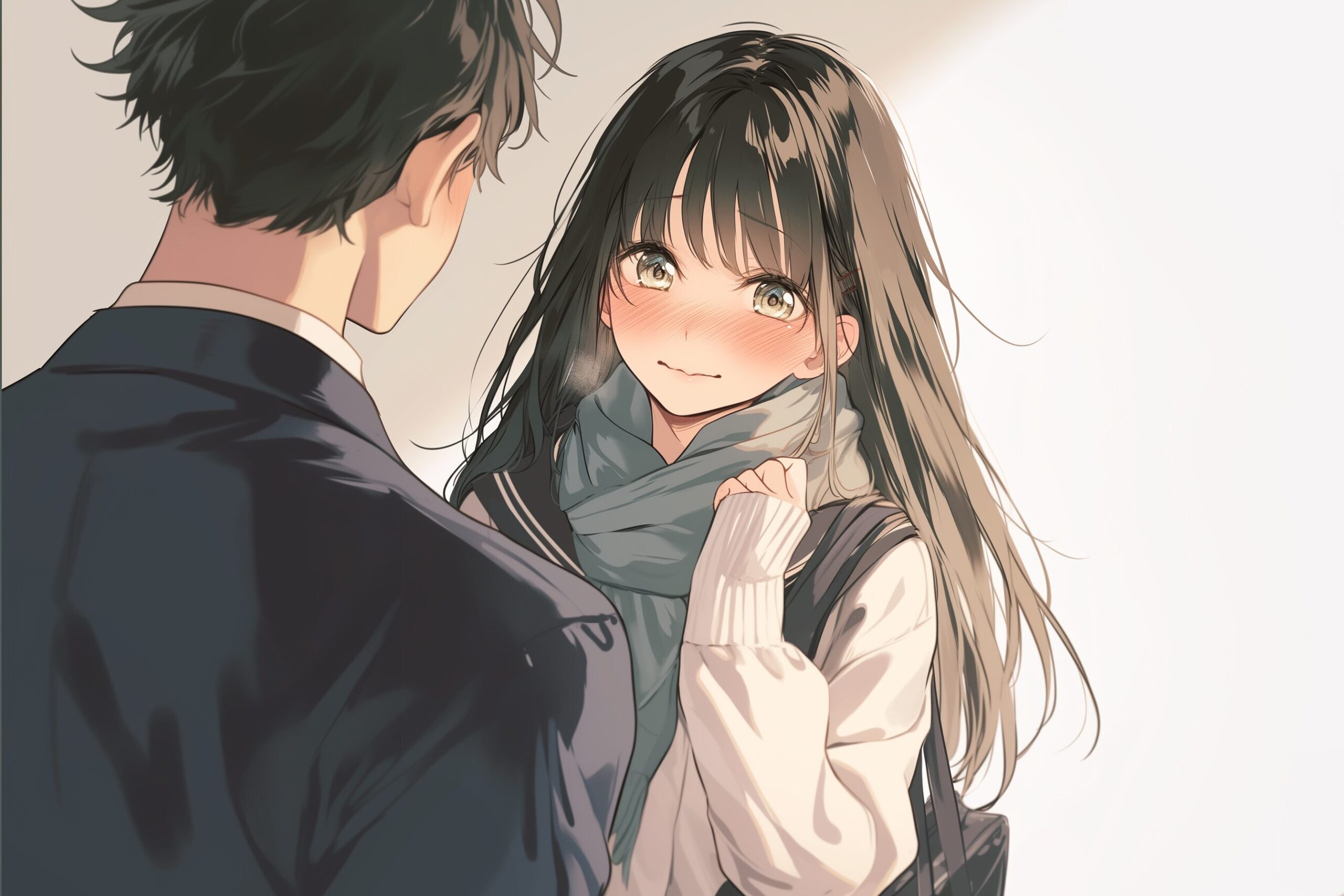 検索タグ:イラスト、キャラクター、女性、女、女の子、女子、女の人、アニメ、漫画、マンガ、美人、美女、若い、かわいい、可愛い、カワイイ、人物、顔、美しい、綺麗、きれい、キレイ、アート、お洒落、挿絵、インスタ、Instagram、AI生成画像、コピースペース、黒髪、横顔、冬服、告白、男女、カップル、見上げる、上目遣い