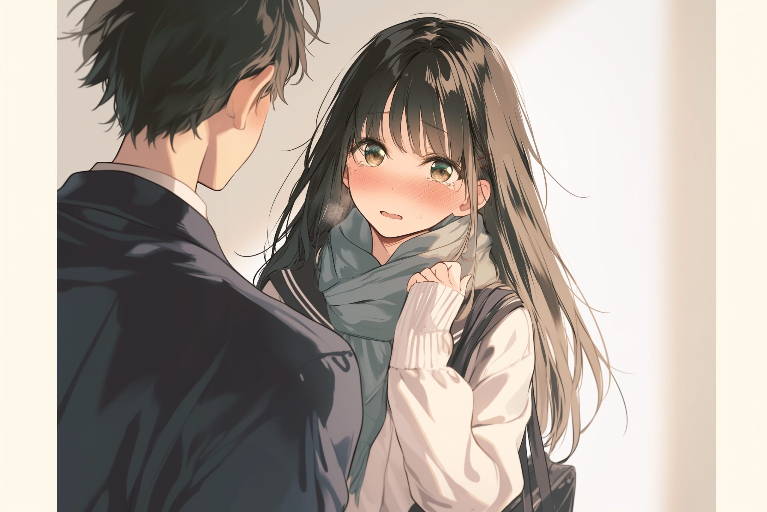 検索タグ:イラスト、キャラクター、女性、女、女の子、女子、女の人、アニメ、漫画、マンガ、美人、美女、若い、かわいい、可愛い、カワイイ、人物、顔、美しい、綺麗、きれい、キレイ、アート、お洒落、挿絵、インスタ、Instagram、AI生成画像、コピースペース、黒髪、横顔、冬服、告白、男女、カップル、見上げる、上目遣い
