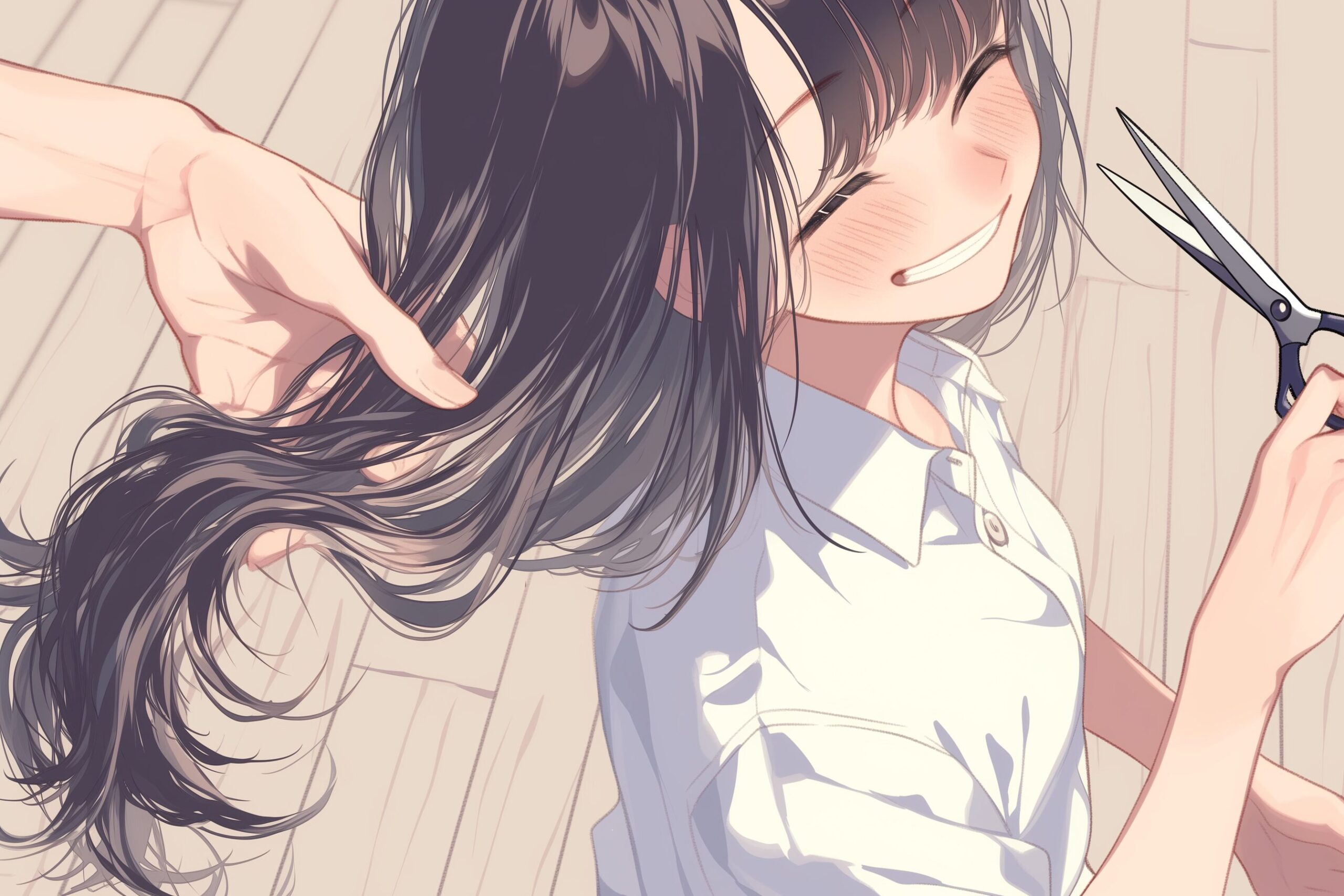 検索タグ:イラスト、キャラクター、女性、女、女の子、女子、女の人、アニメ、漫画、マンガ、美人、美女、若い、かわいい、可愛い、カワイイ、人物、顔、美しい、綺麗、きれい、キレイ、アート、お洒落、挿絵、インスタ、Instagram、AI生成画像、コピースペース、黒髪、散髪、髪、カット、はさみ、ハサミ