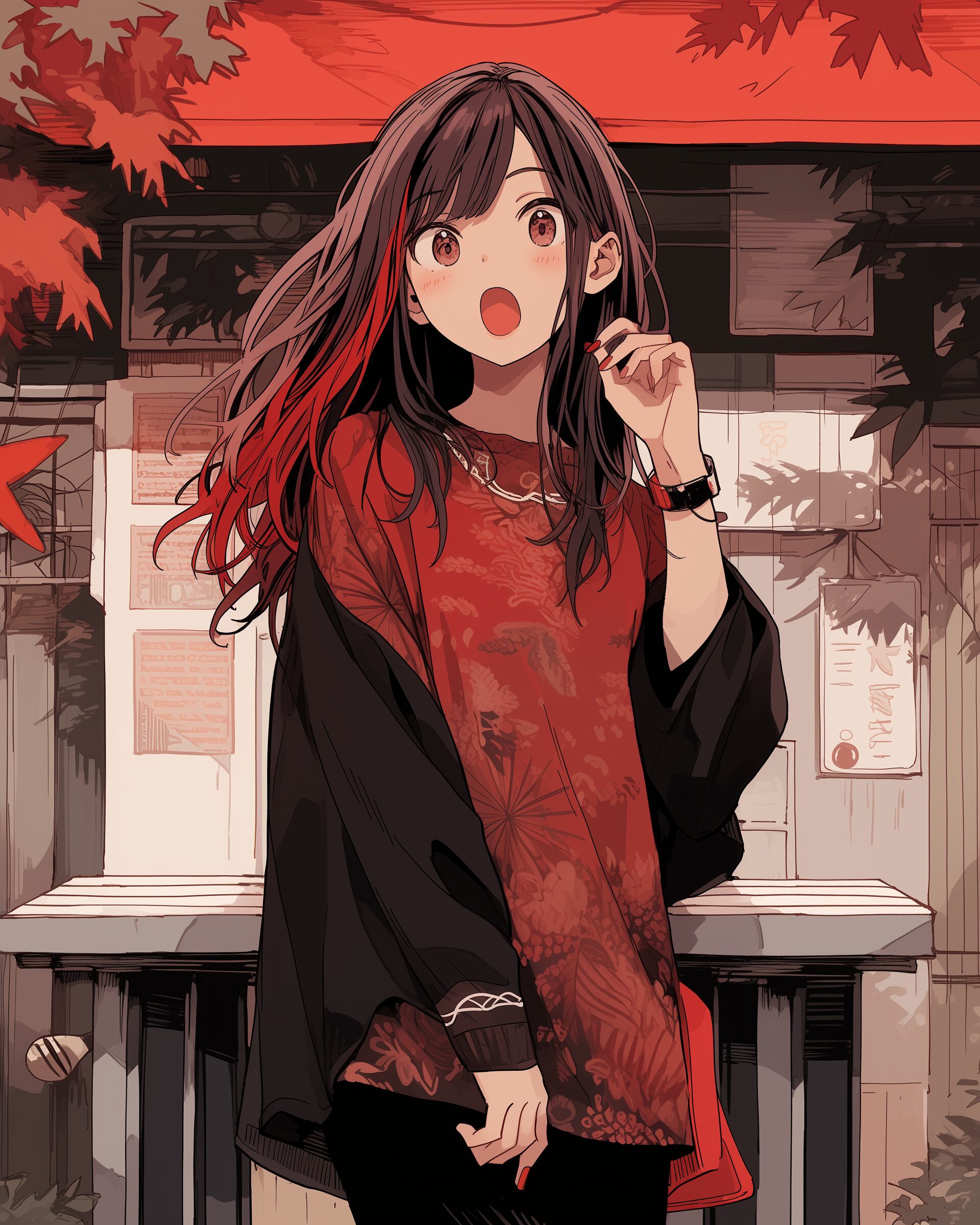 検索タグ:イラスト、ファッション、キャラクター、女性、女、女の子、女子、女の人、アニメ、漫画、マンガ、美人、美女、若い、かわいい、可愛い、カワイイ、人物、顔、美しい、綺麗、きれい、キレイ、アート、お洒落、挿絵、インスタ、Instagram、fashion、コピースペース、おしゃれ、オシャレ、秋、秋服、紅葉、もみじ、モミジ、赤、RED、レッド、待ち合わせ、驚く、驚き、驚愕