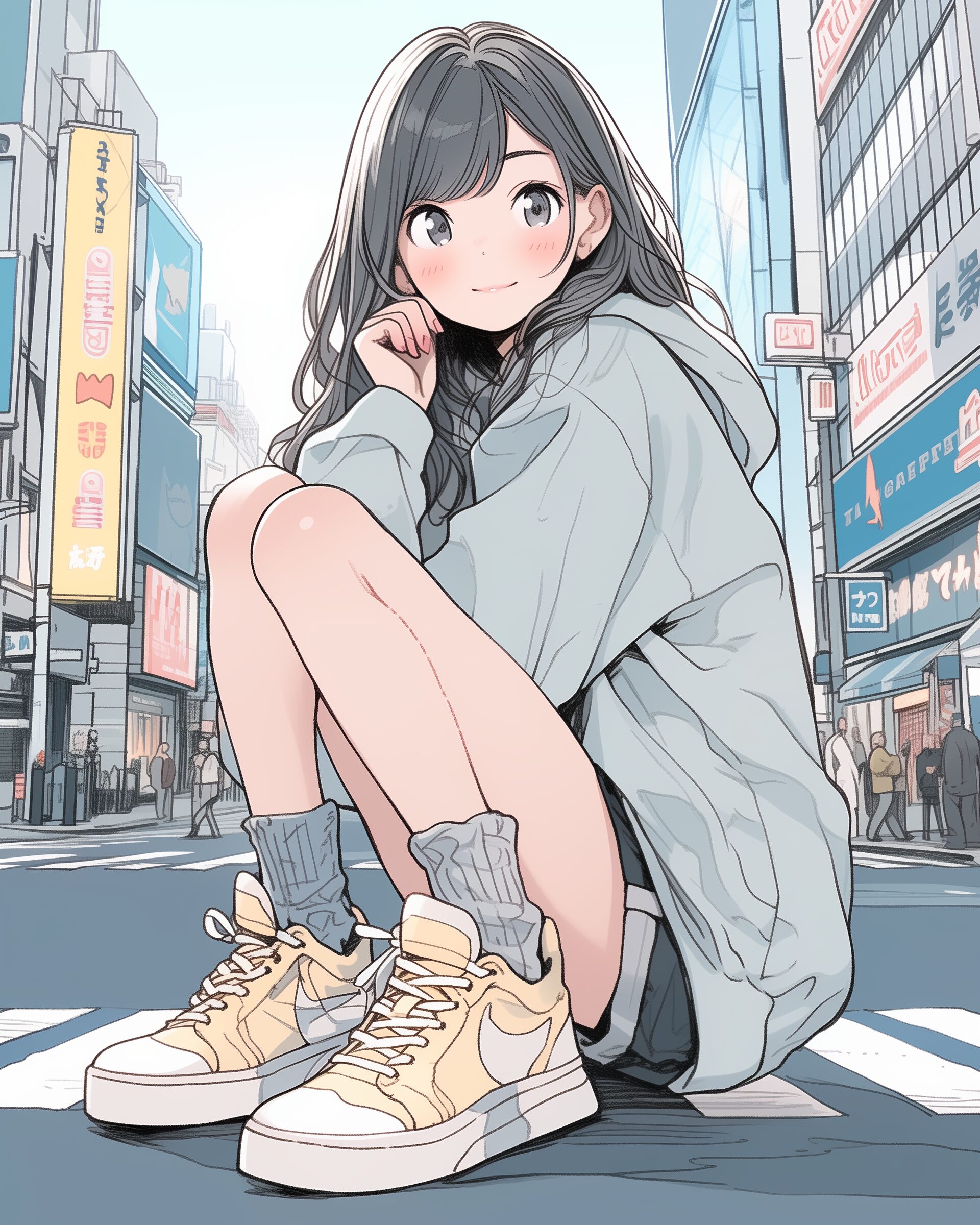 検索タグ:イラスト、ファッション、キャラクター、女性、女、女の子、女子、女の人、アニメ、漫画、マンガ、美人、美女、若い、かわいい、可愛い、カワイイ、人物、顔、美しい、綺麗、きれい、キレイ、アート、お洒落、挿絵、インスタ、Instagram、AI生成画像、fashion、コピースペース、おしゃれ、オシャレ、秋、秋服、パーカー女子、青、ブルー、Blue、座る、都会