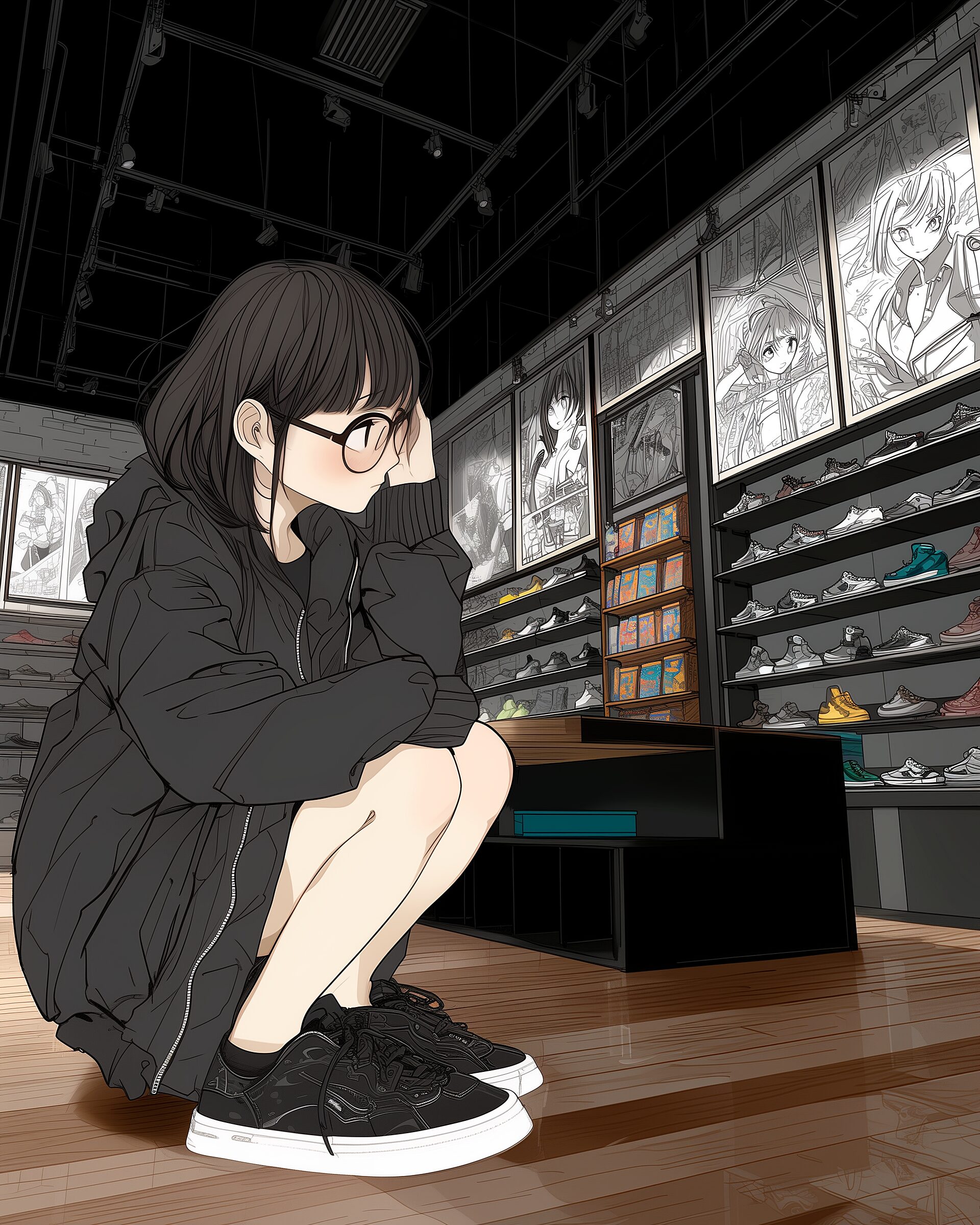 検索タグ:イラスト、キャラクター、女子、女の子、女性、女、女の人、アニメ、漫画、マンガ、若い、人物、顔、美しい、綺麗、きれい、キレイ、アート、お洒落、挿絵、インスタ、Instagram、AI生成画像、コピースペース、かわいい、可愛い、カワイイ、黒髪、橘、たちばな、ゆず、柚、キャラクター、ショートヘア、黒髪、メガネ、眼鏡、めがね、前髪ぱっつん、パッツン、パーカー女子、黒、ブラック、全身、コーディネート、ファッション、ブラックファション、スニーカー、店内、靴、ショッピング、悩む、悩み、考える、座る、しゃがむ