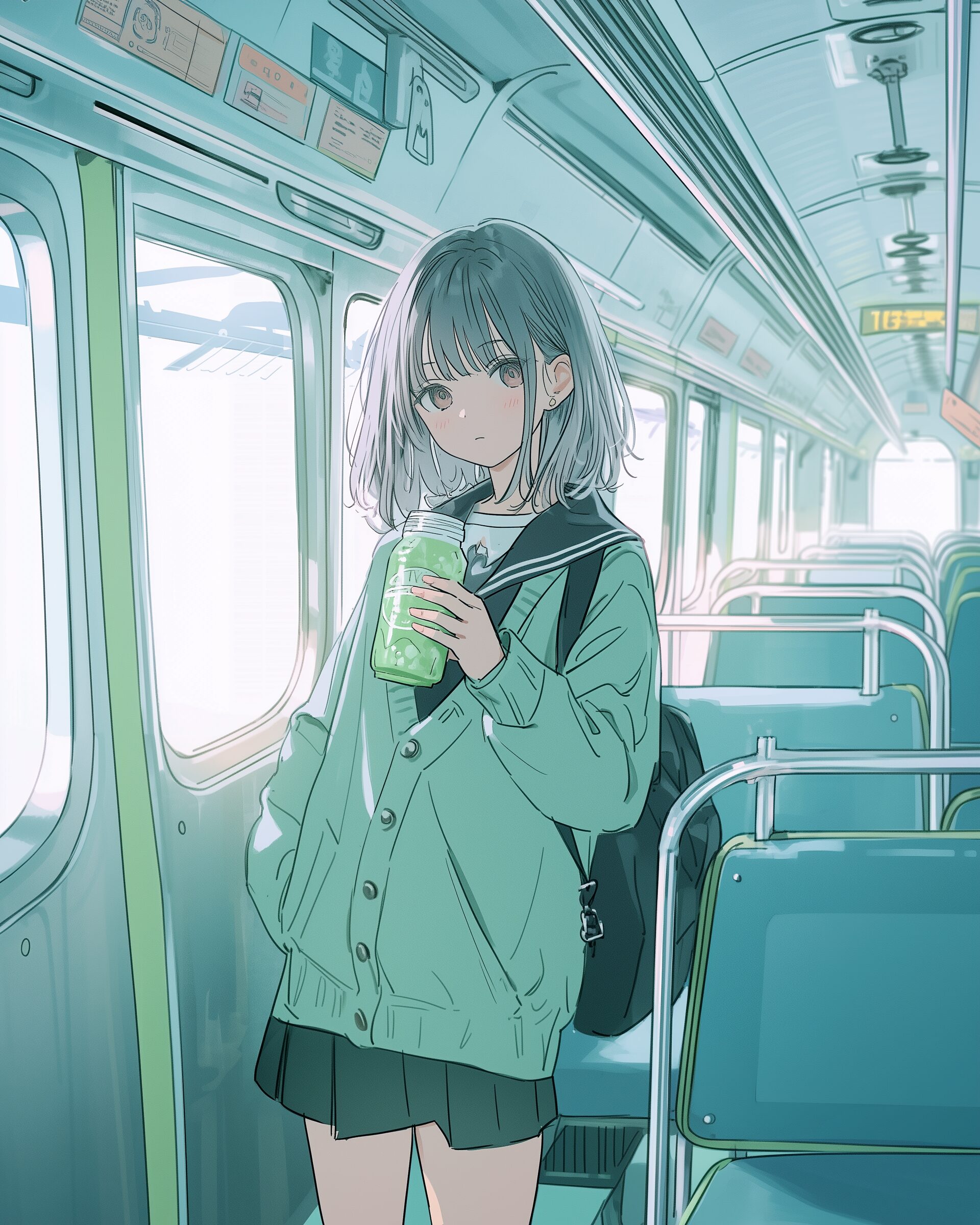 検索タグ:イラスト、ファッション、キャラクター、女性、女、女の子、女子、女の人、アニメ、漫画、マンガ、美人、美女、若い、かわいい、可愛い、カワイイ、人物、顔、美しい、綺麗、きれい、キレイ、アート、お洒落、挿絵、AI生成画像、fashion、コピースペース、エモい、青春、フリー素材、フリー画像、無料、綺麗、jk、制服、wallpaper、壁紙、待ち受け画像、フリー素材、フリー画像、無料、ロック画面、飲み物、ジュース、カーディガン、緑、グリーン、メロンソーダ、学校帰り、通学、電車、車内