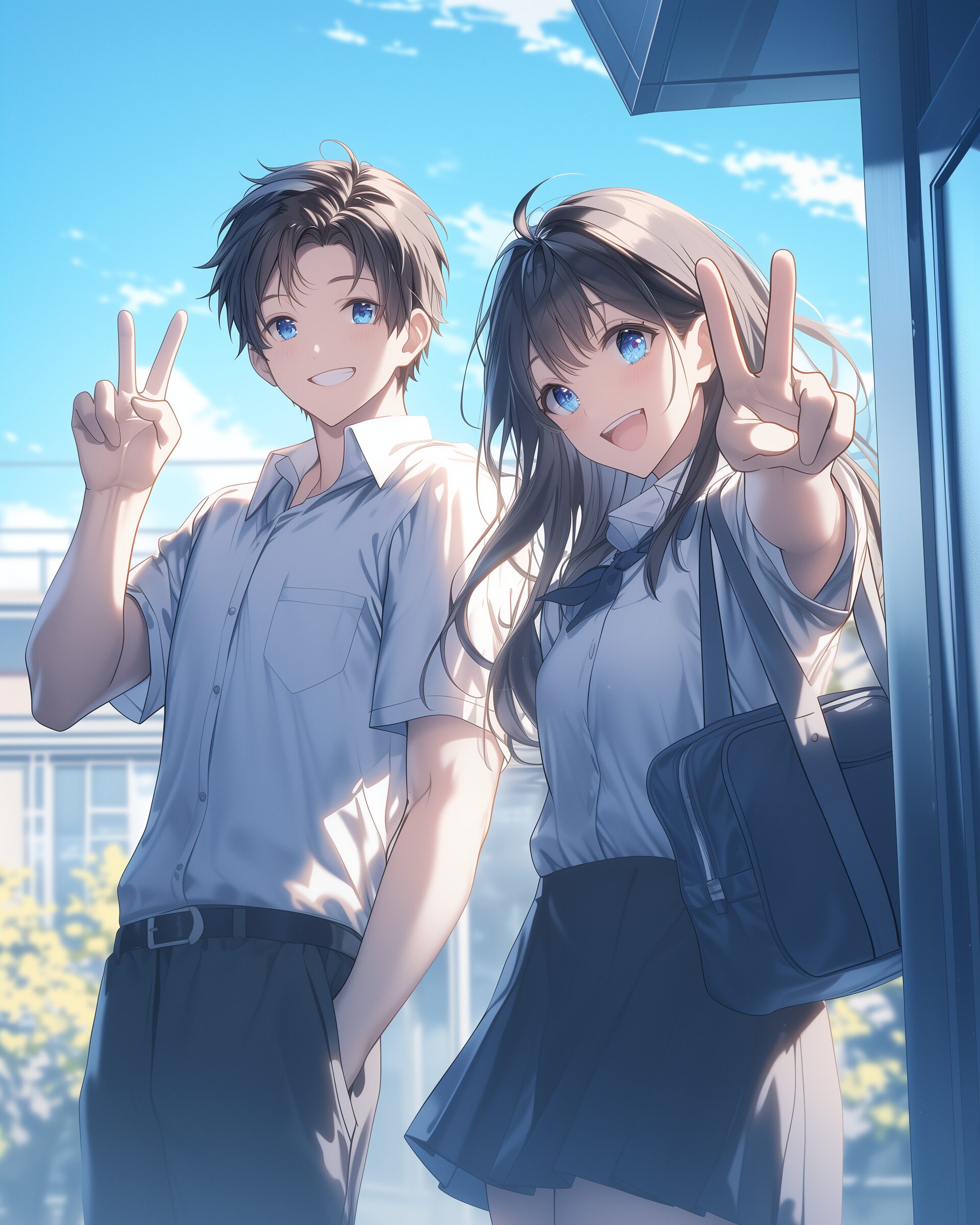 検索タグ:カップル、イラスト、恋人、恋愛、MV、ミュージックビデオ、アニメ、エモい、夏の終わりが来るたびに、ピース、ちょき、チョキ、青春、アオハル、AI生成画像、ペア画、ペア、仲良し、ニコイチ、学生、高校生、中学生