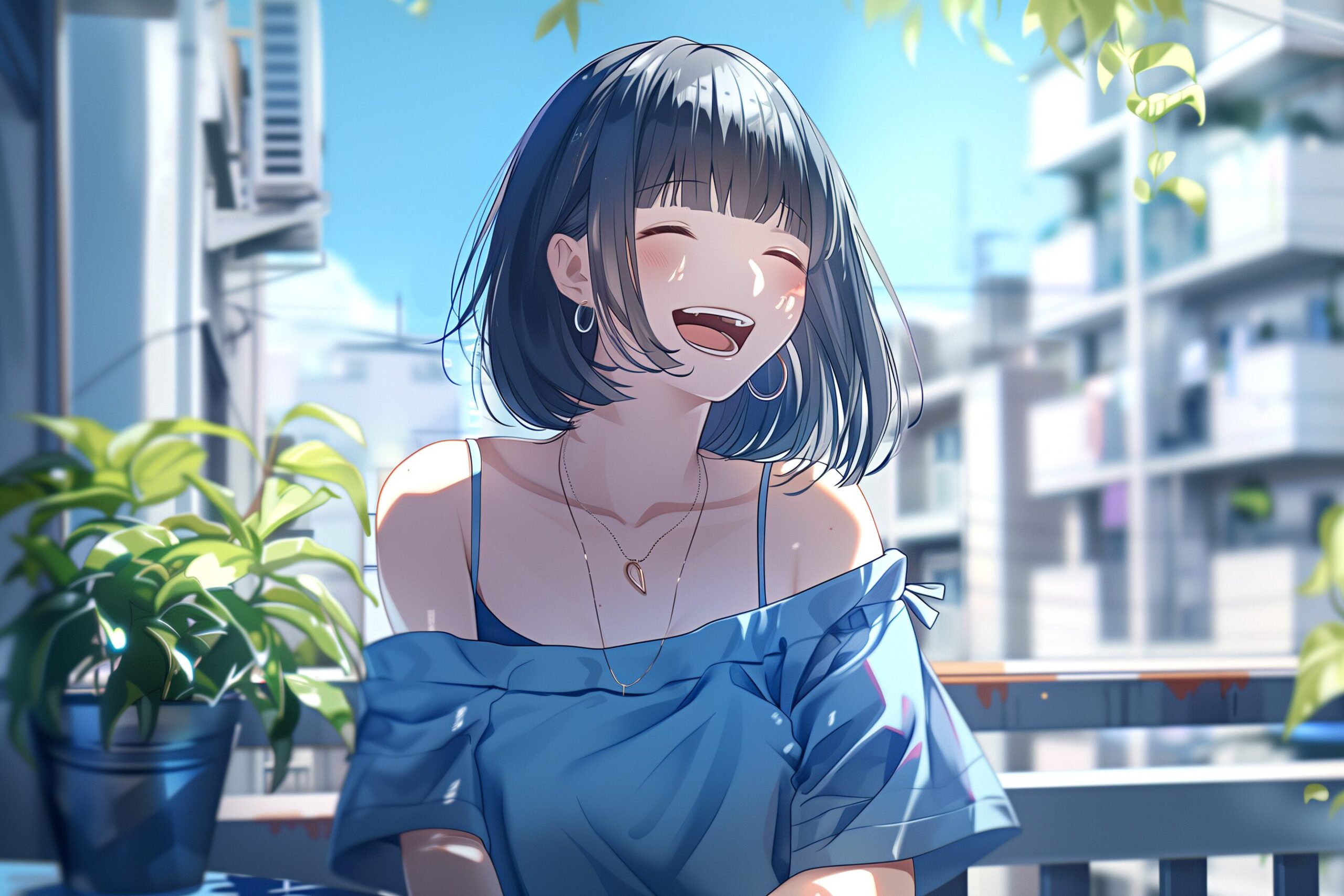検索タグ:イラスト、ファッション、キャラクター、女性、女、女の子、女子、女の人、アニメ、漫画、マンガ、若い、かわいい、可愛い、カワイイ、人物、顔、美しい、綺麗、きれい、キレイ、アート、お洒落、挿絵、インスタ、Instagram、AI生成画像、フリー素材、フリー画像、無料、コピースペース、スマイル、Smile、黒髪、ボブヘア、ベランダ、夏、夏服、オフショル、おしゃれ、オシャレ